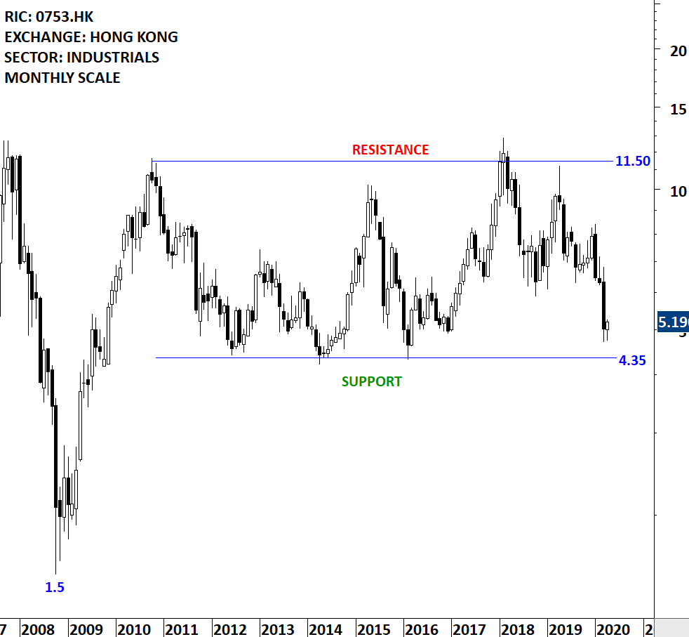 Air China Limited is a China-based company principally engaged in the provision of air passenger transportation, freight transportation, postal transportation and maintenance services in Mainland China, Hong Kong, Macau and foreign regions. The Company is also engaged in domestic and international business aviation businesses, plane business, aircraft maintenance, airlines business agents, ground and air express services related to main businesses, duty free on boards, retail business on boards and aviation accident insurance sales agents business. The stock is listed on the Hong Kong Stock Exchange. Price chart formed a decade-long rectangle with the horizontal boundary acting as strong support at 4.35 levels. The horizontal boundary was tested several times over the course of the chart pattern. Given the Global pandemic and its effects, it is hard to justify a long trade idea in the airline industry. However, the levels Air China is testing can offer a long-term opportunity. (Learn more: Support & Resistance)