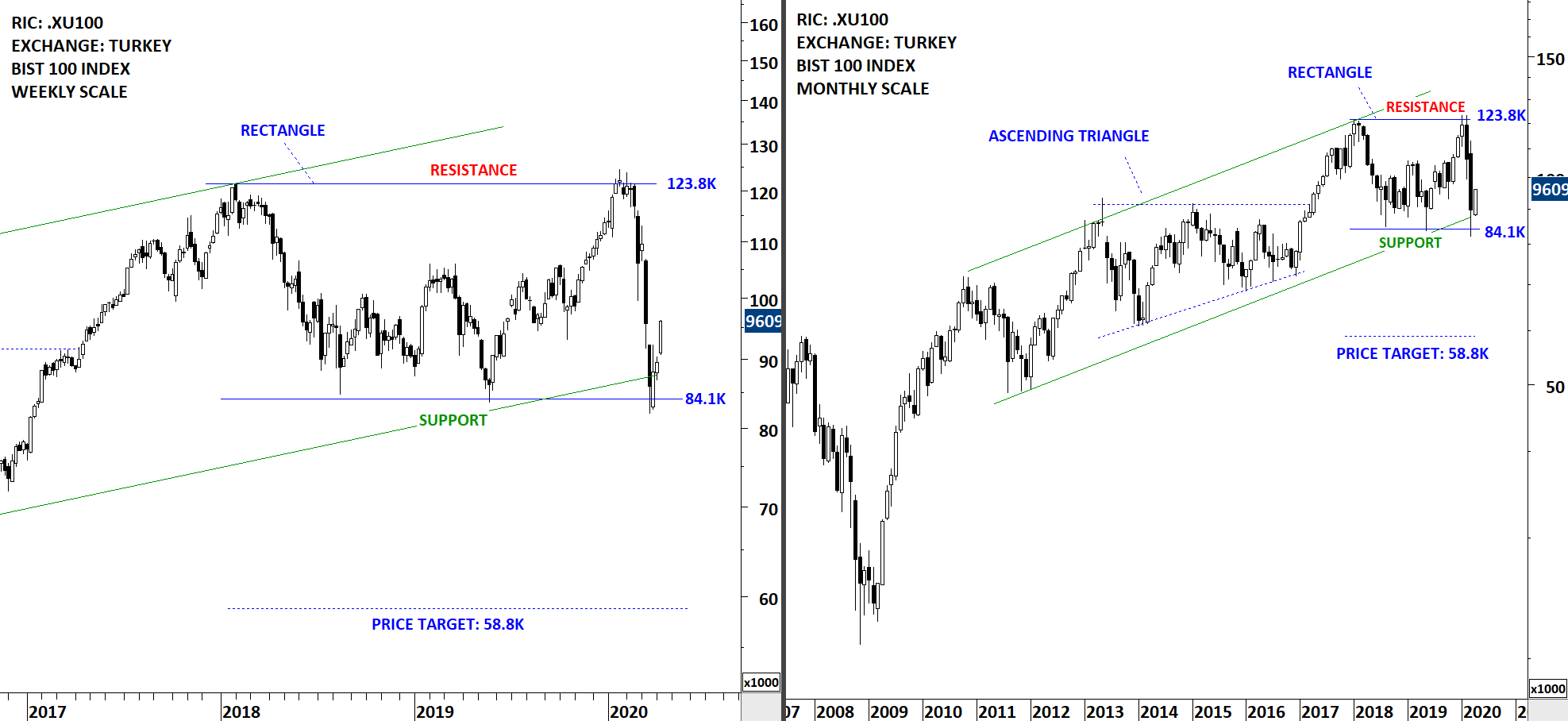 Turkey’s BIST 100 equity benchmark rebounded from the strong horizontal support at 84.1K. This was the 3rd test over the past 2 years. The monthly scale chart shows a possible trend channel. Both the lower boundary of the trend channel and the horizontal support are overlapping at the same level, making it a strong technical support. A breakdown below the horizontal support can reverse the trend and also complete the sideways consolidation as a top reversal. In that case the price target will be 58.8K. If the index manages to hold above the support, the new medium-term trading range becomes 84.1K-123.8K.