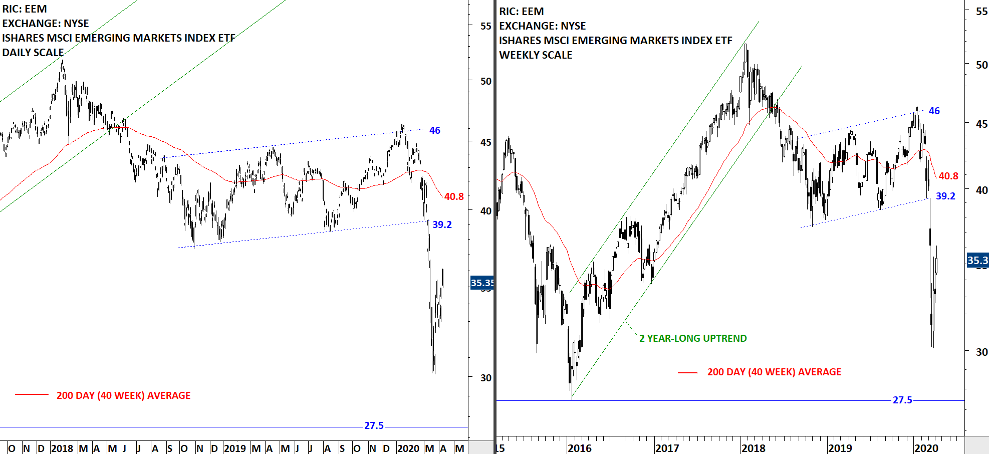 The benchmark for the Emerging Markets performance, the iShares MSCI Emerging Markets Index ETF (EEM) was anothe price chart that resumed its rebound from oversold conditions. Resistance area formed by the lower boundary of channel and the 200-day average remains between 39.2 and 40.8 levels. The ETF is in a downtrend and there is no chart pattern development on daily and weekly scale price charts.