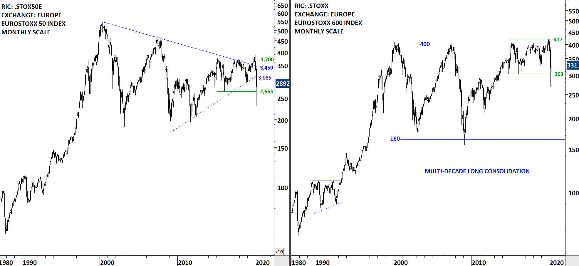 Long-term charts of Euro Stoxx 50 and Euro Stoxx 600 reversed below their chart pattern boundaries (400 on EuroStoxx 600 and 3,450 on EuroStoxx 50). The sell-off tested 2016 lows both on Euro Stoxx 600 and Euro Stoxx 50. Breakdown below the lows of 2016 (303 for Euro Stoxx 600 and 2,665 for Euro Stoxx 50) can resume downtrend. This was another week that both indices managed to close above the support levels. It is important to note that Euro Stoxx 50 broke down decade-long uptrend (purple trend line). During any rebound, a possible pullback to the broken trend line, 3,000-3,085 area will act as resistance.