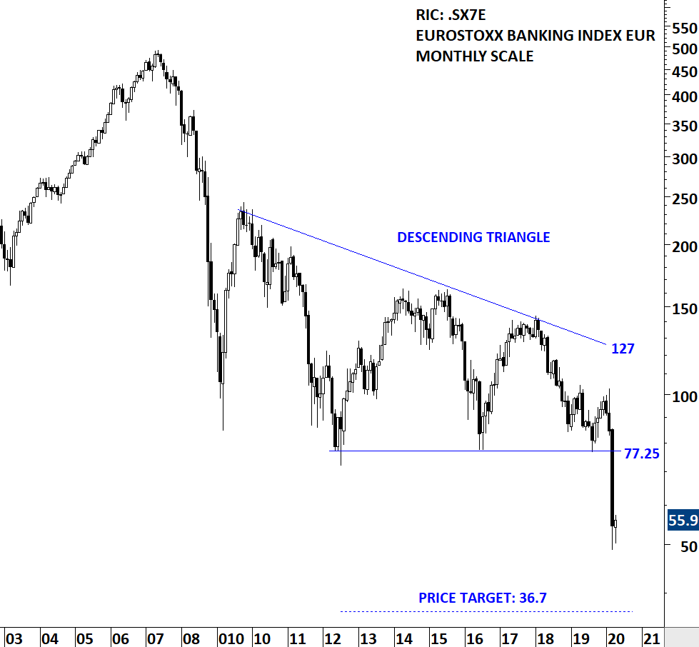 European banks are in trouble. This is a very bearish chart. Breakdown below the horizontal support confirmed the decade-long consolidation as a descending triangle and suggested a price objective at 36.7 levels. 77.25 becomes the new resistance. After a weak monthly close, the price continues to remain weak in April.