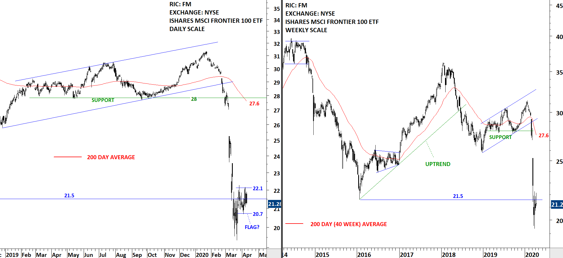 The benchmark for the Frontier equity markets performance, the iShares MSCI Frontier 100 ETF, broke down its support at 21.5 levels. FM ETF is the first one from ACWI, EEM and FM that fell below its 2016 lows. So far the price action has been a pullback to 21.5 levels. I monitor the daily charts for possible reversal signals. Last few week’s consolidation can be a short-term flag.