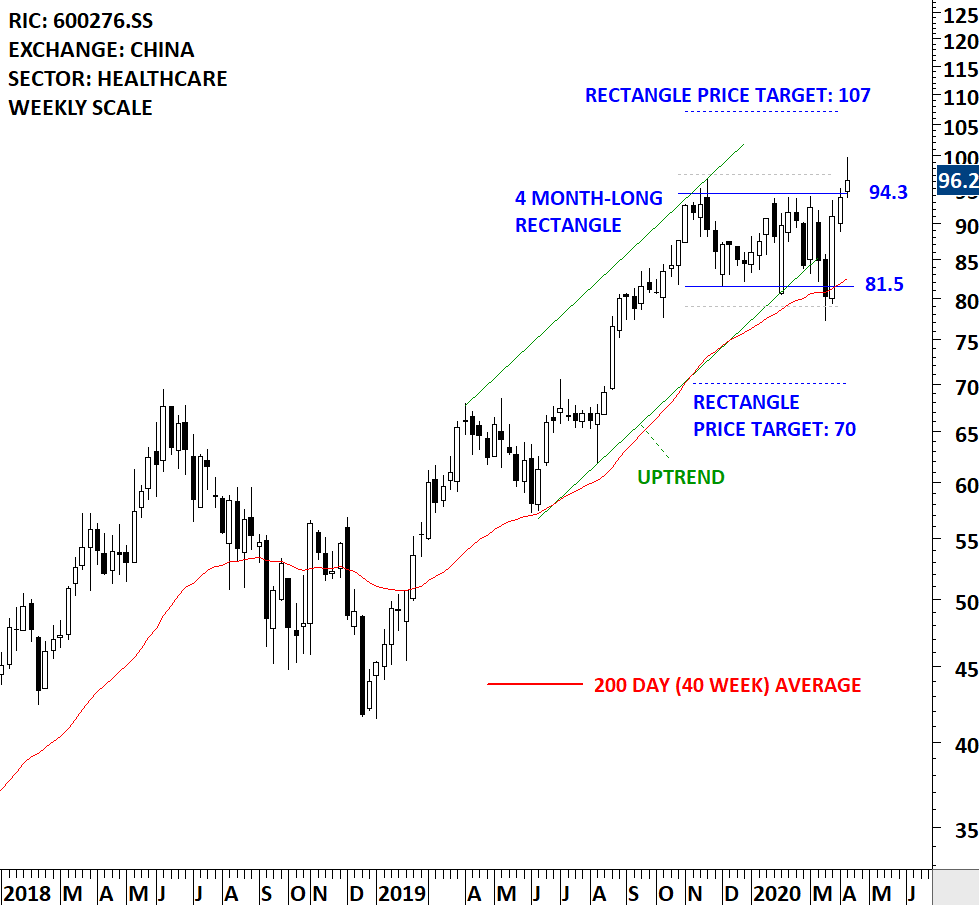 JIANSU HENGRUI MEDICINE CO., LTD. is a China-based company, principally engaged in the manufacture and distribution of pharmaceutical tablets, injections and raw materials. The Company’s main products portfolio consists of antineoplastic drugs, angiomyocardiac drugs, drugs for surgery, contrast agents, antibiotics, specialty infusions and others. The Company distributes its products within domestic market and to overseas markets. The stock is listed on the Shanghai Stock Exchange. Price chart formed a 4 month-long rectangle with the horizontal boundary acting as strong resistance at 94.30 levels. The horizontal boundary was tested several times over the course of the chart pattern. A daily close above 97.10 levels will confirm the breakout from the 4 month-long rectangle with the possible chart pattern price target of 107.0 levels. (Learn more: Video Tutorial)