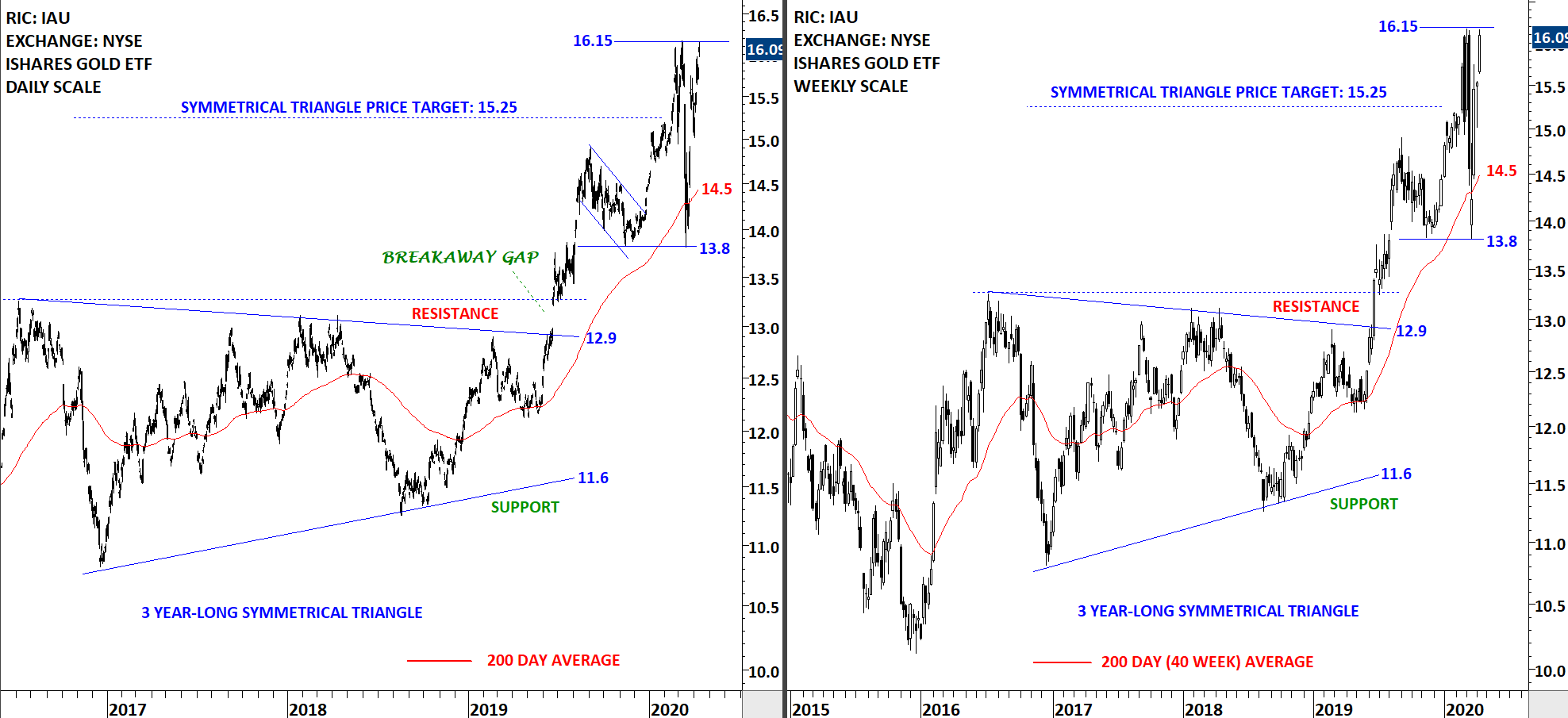 The iShares Gold ETF closed the week at the minor resistance. Wild swings between 13.8 and 16.15 has been the norm for the past 2 months. The sharp rebound from 13.8 levels pushed the ETF to test the resistance at 16.15 levels once again. Price remains above the 200-day average and that is an uptrend. Strong support area remains between 13.8 and 14.5 levels.