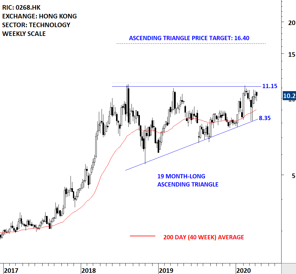Kingdee International Software Group Company Limited is a Hong Kong-based investment holding company principally engaged in the provision of enterprise resource planning (ERP) services. The Company operates through two segments. ERP and Cloud Services segment is engaged in the sales and implementation of enterprise management software and the provision of related services, the sales of hardware related to enterprise management software arrangements, middleware software businesses and the provision of e-commerce and other online management services. Others segment is engaged in the operation of investment properties. The stock is listed on the Hong Kong Stock Exchange. Price chart formed a 19 month-long ascending triangle with the horizontal boundary acting as strong resistance at 11.15 levels. The horizontal boundary was tested several times over the course of the chart pattern. A daily close above 11.5 levels will confirm the breakout from the 19 month-long ascending triangle with the possible chart pattern price target of 16.4 levels. Stocks that hold well during corrections will be the ones to record new all-time highs when momentum returns. (Learn more: Video Tutorial)