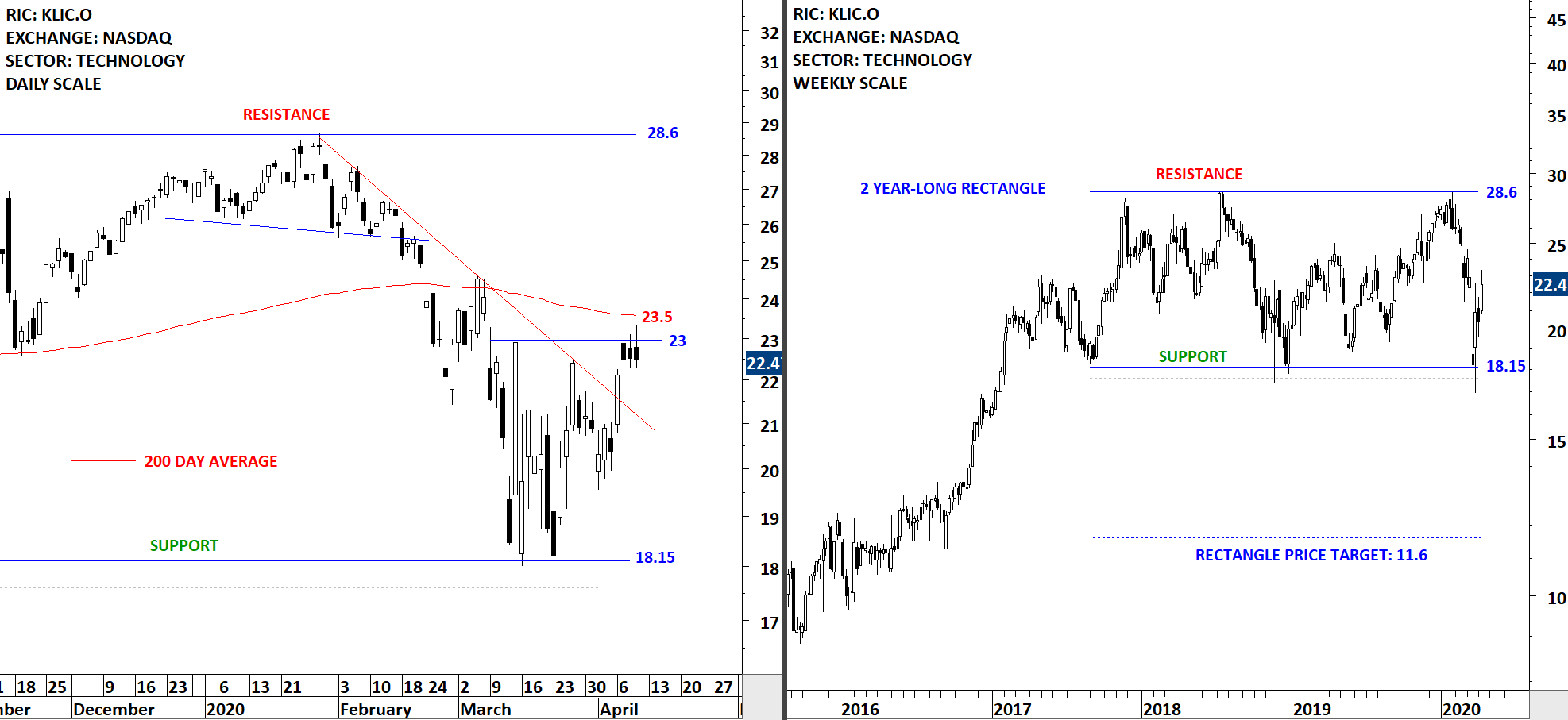 Kulicke and Soffa Industries, Inc. designs, manufactures and sells capital equipment and expendable tools used to assemble semiconductor devices, including integrated circuits (ICs), high and low powered discrete devices, light-emitting diodes (LEDs) and power modules. The stock is listed on the Nasdaq Stock Exchange. Price chart formed a 2 year-long rectangle with the horizontal boundaries acting as strong support at 18.15 levels and resistance at 28.6 levels. Both boundaries were tested several times over the course of the chart pattern. Recovery from the lower boundary of the 2 year-long rectangle pulled the price towards the 200-day average at 23.5 levels. Short-term resistance remains between 23 and 23.5 levels. Until there is a decisive breakout from the 2 year-long rectangle, this chart offer trading opportunity between well-defined boundaries. Breakout above the short-term resistance area between 23 and 23.5 can target the upper boundary of the consolidation at 28.6 levels. (Learn more: Support & Resistance)