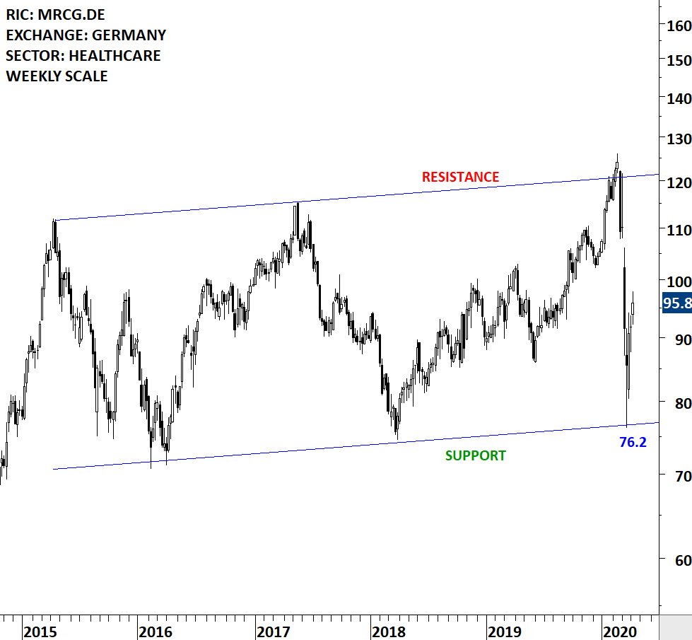 Merck KGaA is a Germany-based science and technology company. The Company operates in three business segments: Healthcare, Life Sciences and Performance Materials. The stock is listed on the Frankfurt Stock Exchange. Price chart formed a multi year-long consolidation range with lower boundary acting as strong support at 76.20 levels. The stock rebounded from the support. Over the past few days MERCK formed a tight consolidation which can be identified as a bullish flag (shown on the daily scale price chart). The upper boundary is at 94 levels. A daily close above 96.8 levels can confirm the short-term bullish continuation with the possible chart pattern price target at 110.4 levels. This week’s price action was a borderline breakout. I will monitor this stock for more strength in the following week for breakout confirmation. (Learn more: Flag as a measuring pattern)