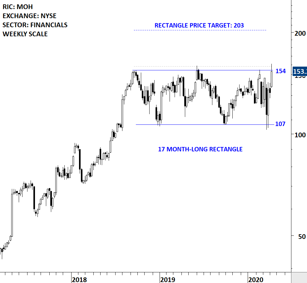 Molina Healthcare, Inc. offers Medicaid-related solutions for low-income families and individuals, and assists government agencies in their administration of the Medicaid program. The stock is listed on the New York Stock Exchange. Price chart formed a 17 month-long rectangle with the horizontal boundary acting as strong resistance at 154.00 levels. The horizontal boundary was tested several times over the course of the chart pattern. A daily close above 158.60 levels will confirm the breakout from the 17 month-long rectangle with the possible chart pattern price target of 203.00 levels. (Learn more: Video Tutorial)