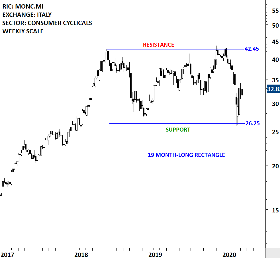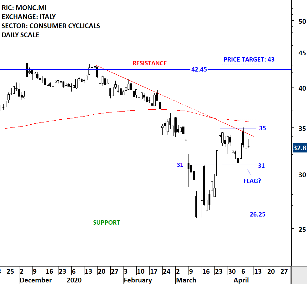Moncler SpA is an Italy-based company engaged in fashion industry. The Company designs, produces and distributes clothing and accessories through Moncler brand. The stock is listed on the Milan Stock Exchange. Price chart formed a 19 month-long rectangle with the horizontal boundary acting as strong support at 26.26 levels. Moncler had a strong rebound from the horizontal support. Over the past few days the stock formed a short-term consolidation between 31 and 35 levels. The short-term consolidation can be identified as a bullish flag. A daily close above 36 levels will confirm the breakout with the possible chart pattern price target at 43 levels. (Learn more: Support & Resistance)