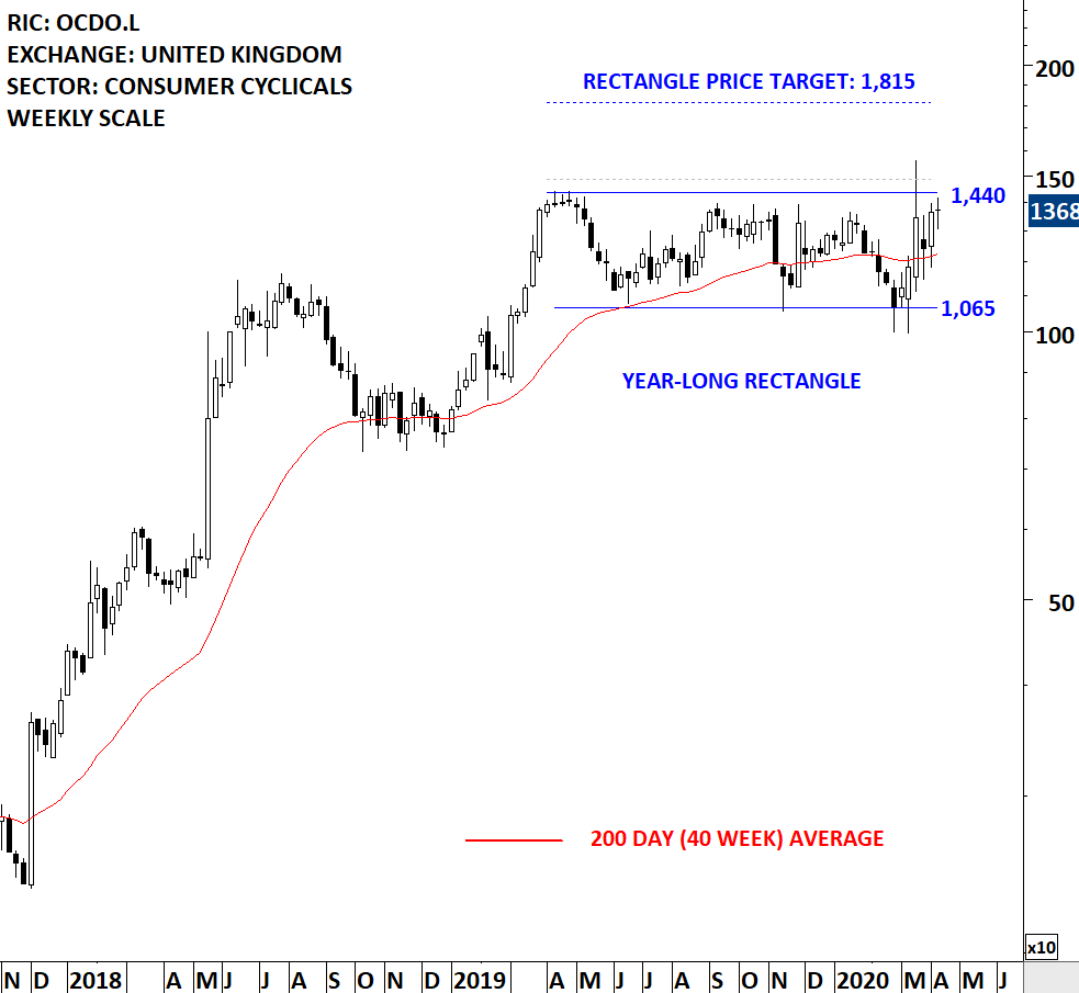 Ocado Group plc is a United Kingdom-based online grocery retailer. The Company’s principal activities are grocery retailing and the development and monetization of Intellectual Property (IP) and technology used for the online retailing, logistics and distribution of grocery and consumer goods, derived from the United Kingdom. The stock is listed on the London Stock Exchange. Price chart formed a year-long rectangle with the horizontal boundary acting as strong resistance at 1,440.0 levels. The horizontal boundary was tested several times over the course of the chart pattern. A daily close above 1,485.0 levels will confirm the breakout from the year-long rectangle with the possible chart pattern price target of 1,815.0 levels. (Learn more: Video Tutorial)