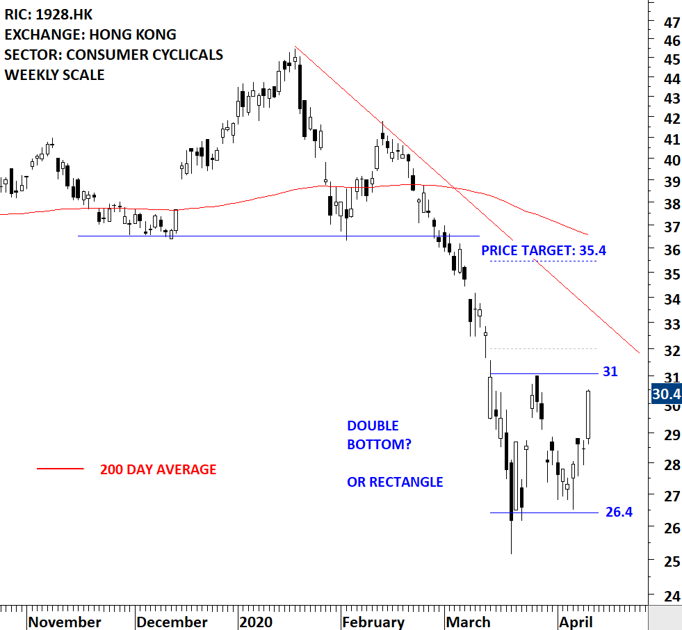 Sands China Ltd. is an investment holding company principally engaged in the development and operation of integrated resorts in Macao. The Company operates many places, including gaming areas, meeting space, convention and exhibition halls, retail and dining areas and entertainment venues. The stock is listed on the Hong Kong Stock Exchange. Price chart is possibly forming a 1 month-long rectangle or double bottom with the horizontal boundary acting as resistance at 31.00 levels. A daily close above 32 levels will confirm the breakout from the 1 month-long rectangle with the possible chart pattern price target of 35.4 levels. Failure to breakout from the 1 month-long consolidation can result in further sideways trading range.