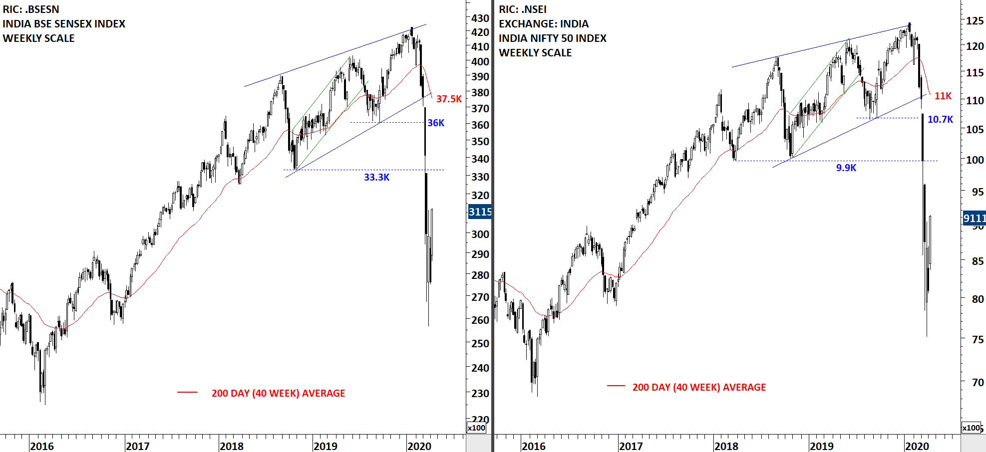 Both BSE Sensex and Nifty 50 fell below their long-term averages and broke down upward sloping trend lines. BSE Sensex broke down 33.3K and Nifty 50 broke down 9.9K. During any rebound those levels will act as resistance. Both indices remain weak. Both indices are in a downtrend. There is no clear chart pattern development that would suggest a bottom reversal.