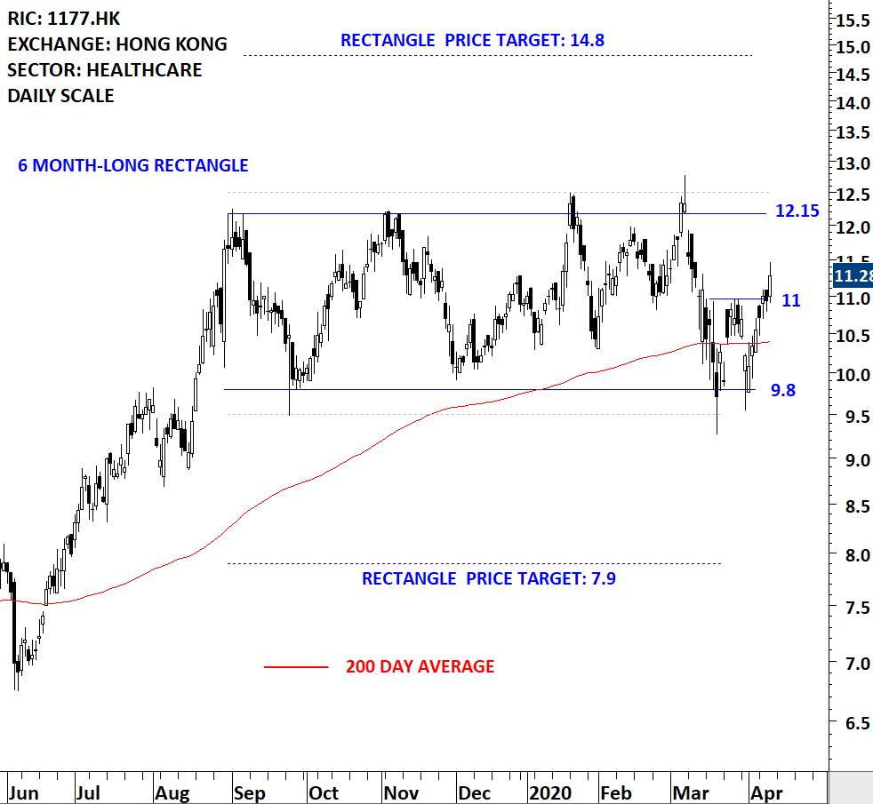 Sino Biopharmaceutical Limited is an investment holding company principally engaged in the medicine products business. The stock is listed on the Hong Kong Stock Exchange. Price chart formed a 6 month-long rectangle with the horizontal boundary acting as strong resistance at 12.15 levels. The horizontal boundary was tested several times over the course of the chart pattern. A daily close above 12.5 levels will confirm the breakout from the 6 month-long rectangle with the possible chart pattern price target at 14.8 levels. A daily close below 9.5 levels can confirm the chart pattern as a rectangle reversal with the price target of 7.9 levels. Latest consolidation above the lower boundary of the rectangle can act as a short-term bottom reversal chart pattern. Short-term resistance was at 11 and price cleared it with this week’s strength. (Learn more: Video Tutorial)