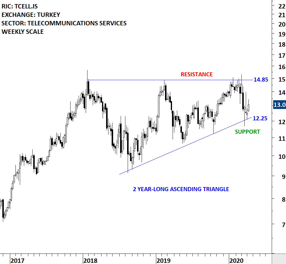 Turkcell Iletisim Hizmetleri AS is engaged in establishing and operating a Global System for Mobile Communications (GSM) network in Turkey and regional states. The stock is listed on the Istanbul Stock Exchange. Price chart formed a 2 year-long ascending triangle with the horizontal boundary acting as strong resistance at 14.85 levels. The lower boundary (upward sloping trend line) is forming support at 12.25 levels. If the chart pattern identified is an ascending triangle, last week’s low marked a medium-term bottom. I will monitor this stock with the possibility of forming a trading range between 12.25 and 14.85 levels. (Learn more: Video Tutorial)
