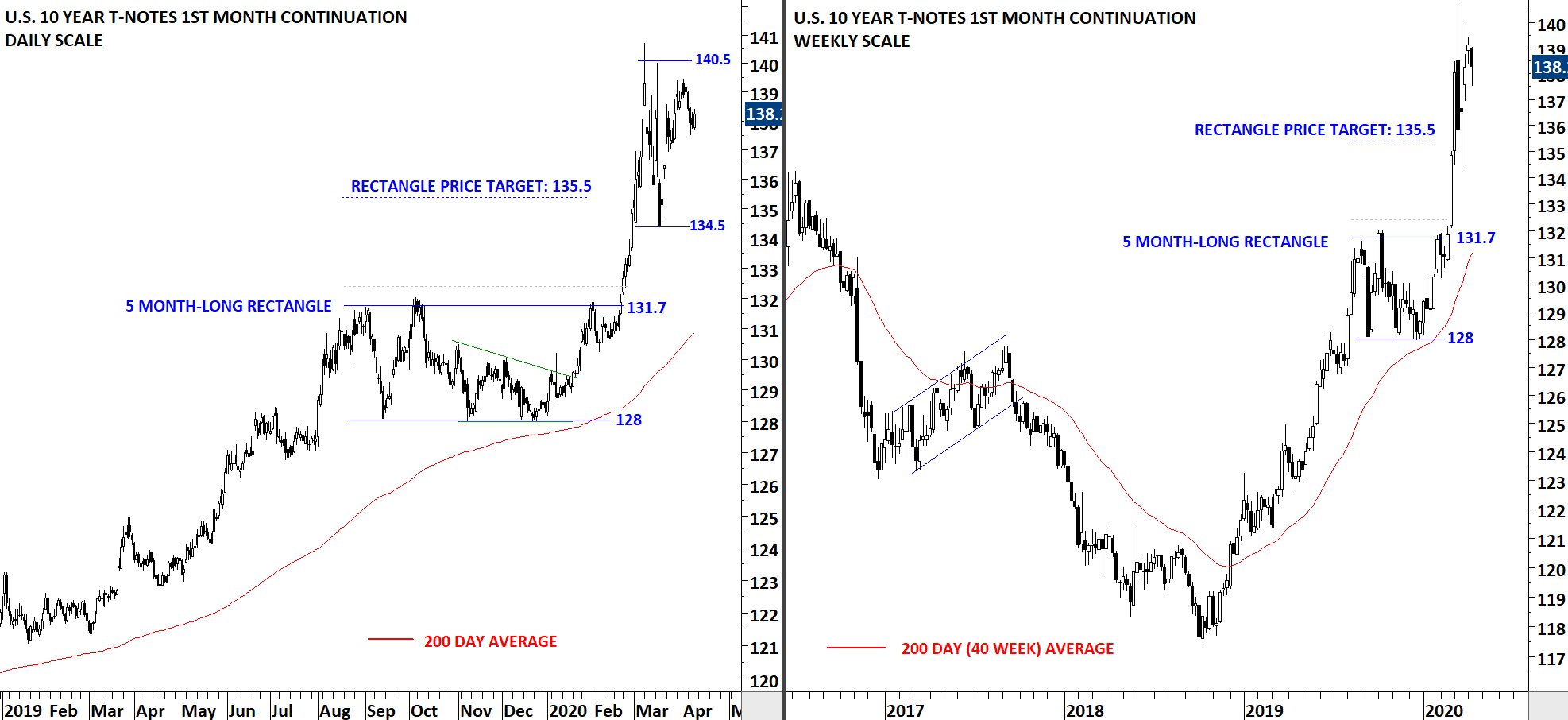 After breaking out of a 5 month-long rectangle continuation chart pattern, U.S. 10 Year T-Notes had a strong rally. Flight to safety (risk off) trade resulted in a rush to government bonds. Price tested the same levels for the 3rd time and reversed. Resistance stands around 140.5 levels. Failure to move higher can result in a trading range between 140.5 and 134.5 levels.