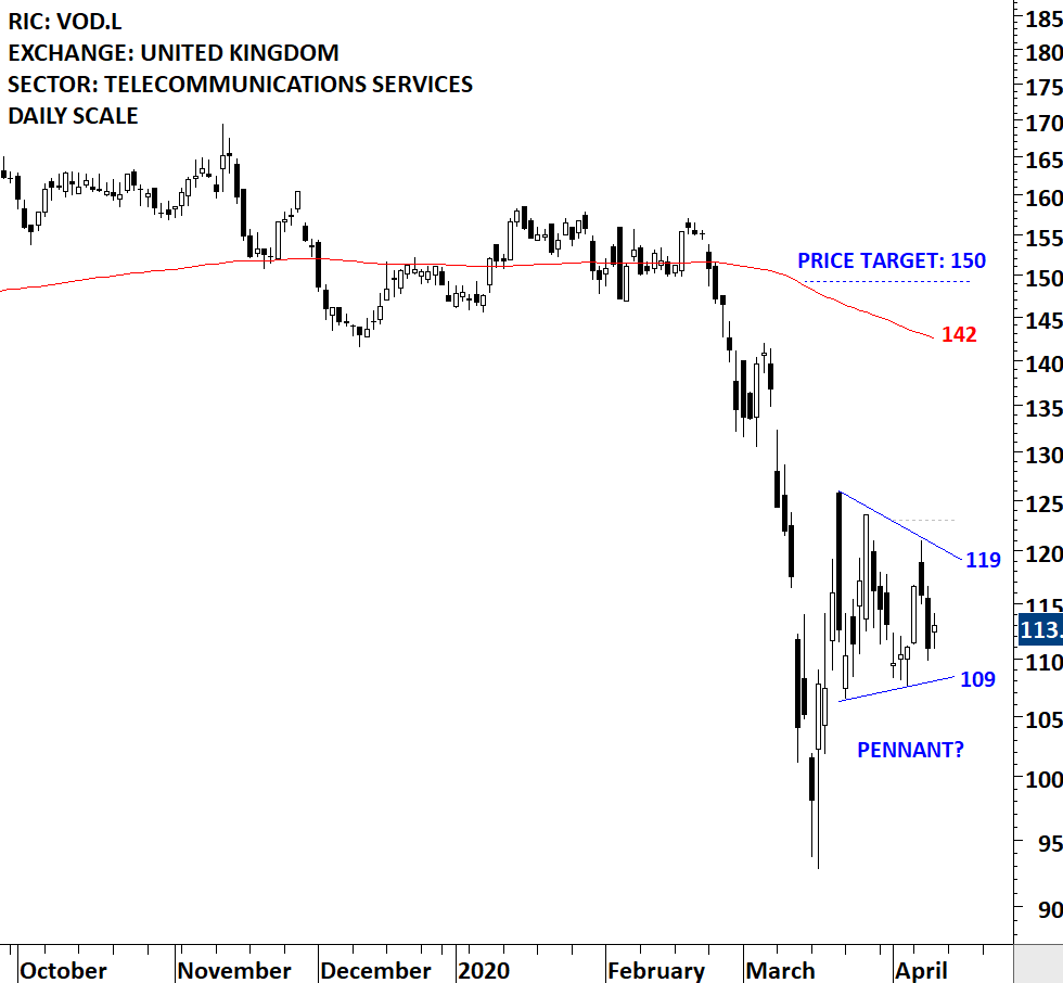 Vodafone Group Plc is a telecommunications company. The Company’s business is organized into two geographic regions: Europe, and Africa, Middle East and Asia Pacific (AMAP). The stock is listed on the London Stock Exchange. Price chart is possibly forming a 1 month-long pennant with the upper boundary acting as resistance at 119.00 levels. A daily close above 123 levels will confirm the breakout from the 1 month-long pennant with the possible chart pattern price target of 150 levels. Short-term chart patterns fail more often than long-term chart patterns.