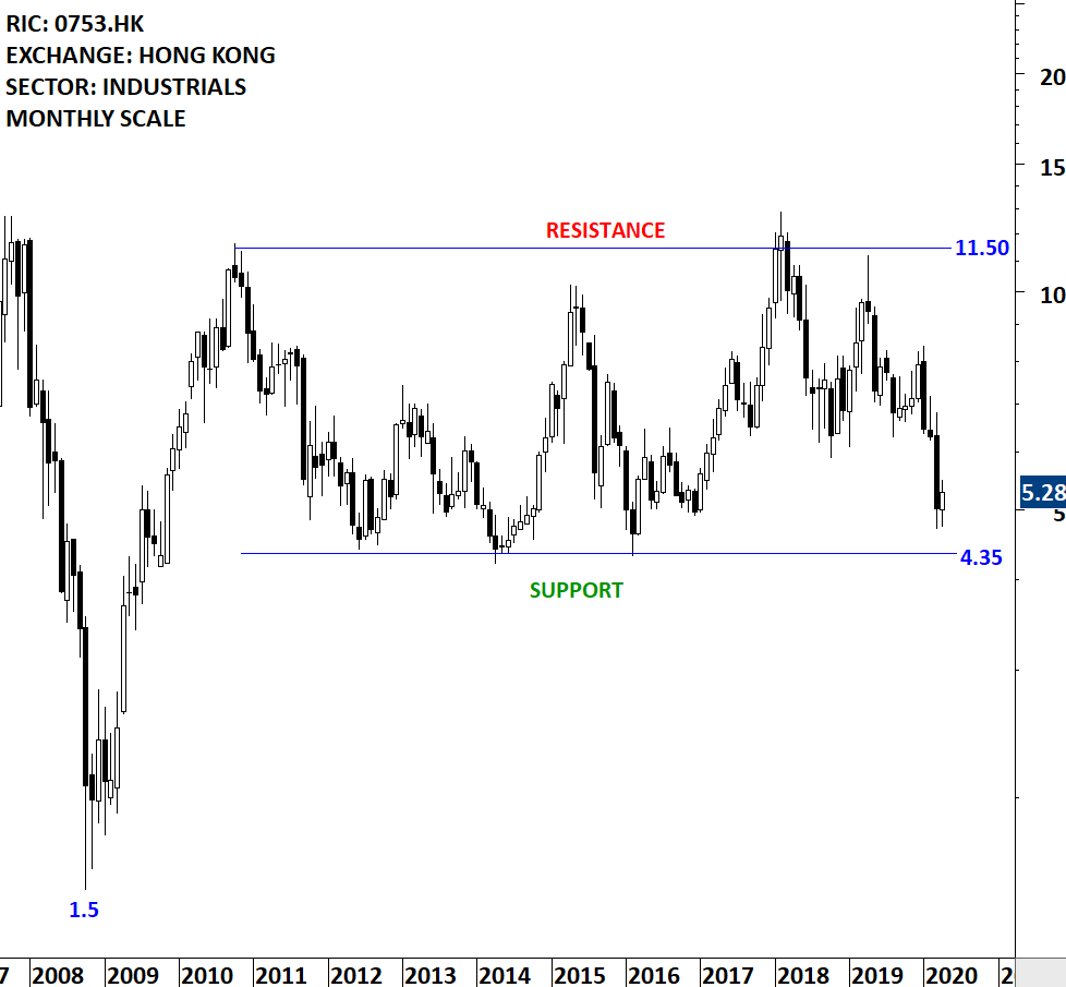 Air China Limited is a China-based company principally engaged in the provision of air passenger transportation, freight transportation, postal transportation and maintenance services in Mainland China, Hong Kong, Macau and foreign regions. The Company is also engaged in domestic and international business aviation businesses, plane business, aircraft maintenance, airlines business agents, ground and air express services related to main businesses, duty free on boards, retail business on boards and aviation accident insurance sales agents business. The stock is listed on the Hong Kong Stock Exchange. Price chart formed a decade-long rectangle with the horizontal boundary acting as strong support at 4.35 levels. The horizontal boundary was tested several times over the course of the chart pattern. Given the Global pandemic and its effects, it is hard to justify a long trade idea in the airline industry. However, the levels Air China is testing can offer a long-term opportunity. (Learn more: Support & Resistance)
