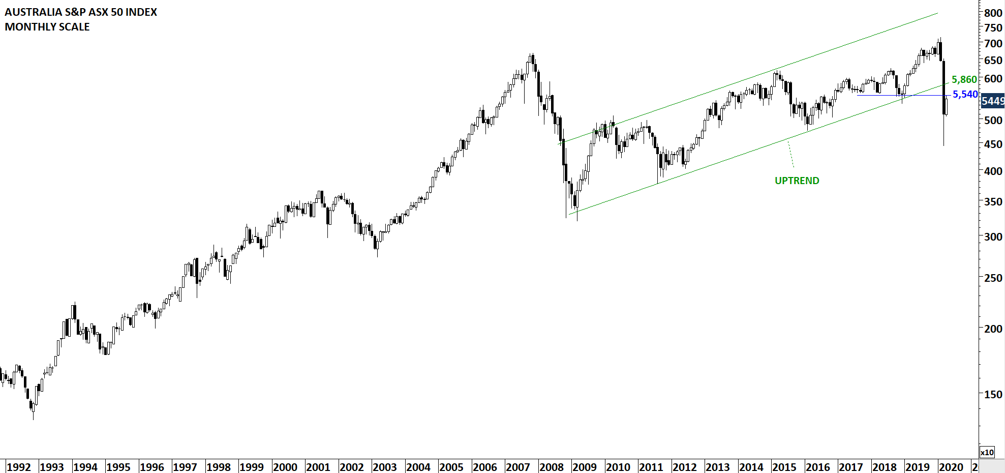Australia S&P ASX 50 Index broke down a decade-long uptrend. I’m usually skeptic with the validity of a diagonal trend line. However, I think the line becomes more reliable as price has several touch points. In this case the lower boundary of the trend channel was tested several times. Price action in April has so far been a rebound/retest of the broken support levels between 5,540 and 5,860.