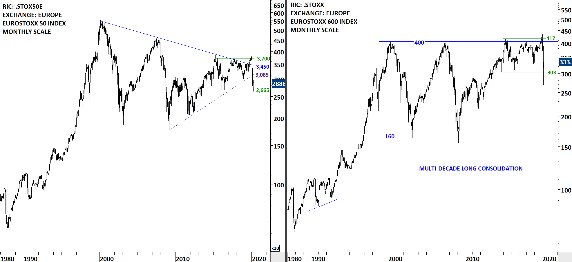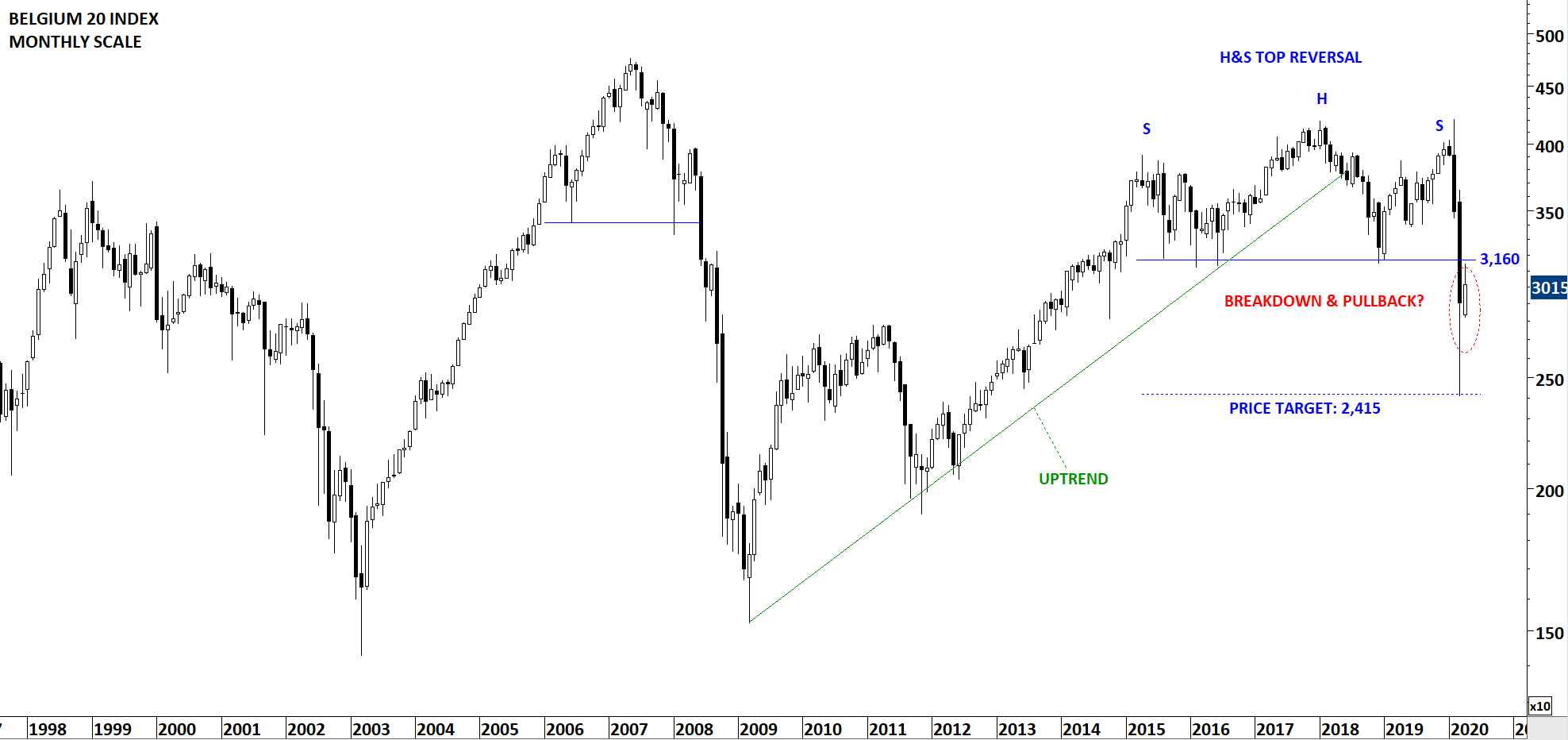 Belgium 20 Index is another benchmark that has completed a multi-year top formation and over the past month has been recovering to test the broken horizontal support/resistance. 3,160 levels continue to be the supply zone. The price target for the H&S top stood at 2,415 levels and it was met during the March sell-off. Unless we see a quick recovery above 3,160 levels, the index can remain weak, trading between 3,160 and 2,415 levels.