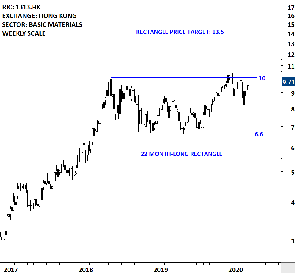 China Resources Cement Holdings Limited is a Hong Kong-based investment holding company principally engaged in the cement and concrete businesses. The Company operates through two business segments. The Cement segment is engaged in the manufacture and sales of cement and related products. The Concrete segment is engaged in the manufacture and sales of concrete and related products. The Company is also involved in the trading of fly ash, mortars and shotcrete, as well as the property holding business through its subsidiaries. The stock is listed on the Hong Kong Stock Exchange. Price chart formed a 22 month-long rectangle with the horizontal boundary acting as strong resistance at 10.00 levels. The horizontal boundary was tested several times over the course of the chart pattern. A daily close above 10.3 levels will confirm the breakout from the 22 month-long rectangle with the possible chart pattern price target of 13.5 levels. (Learn more: Video Tutorial)