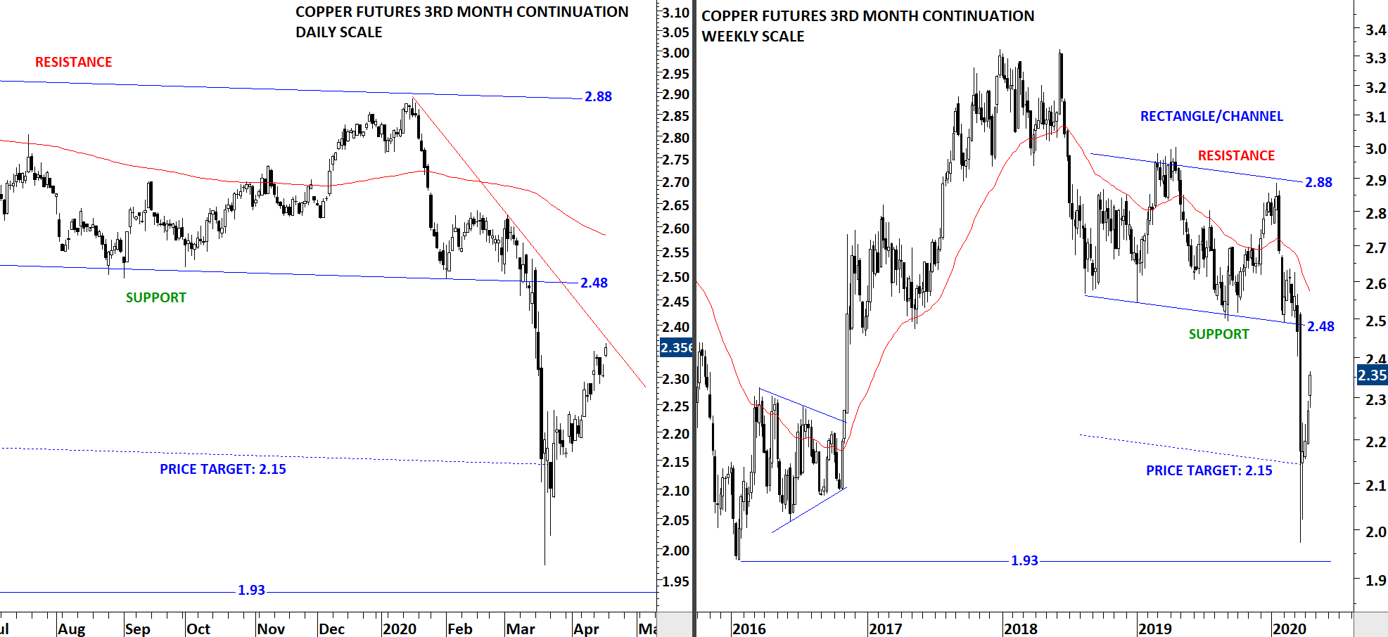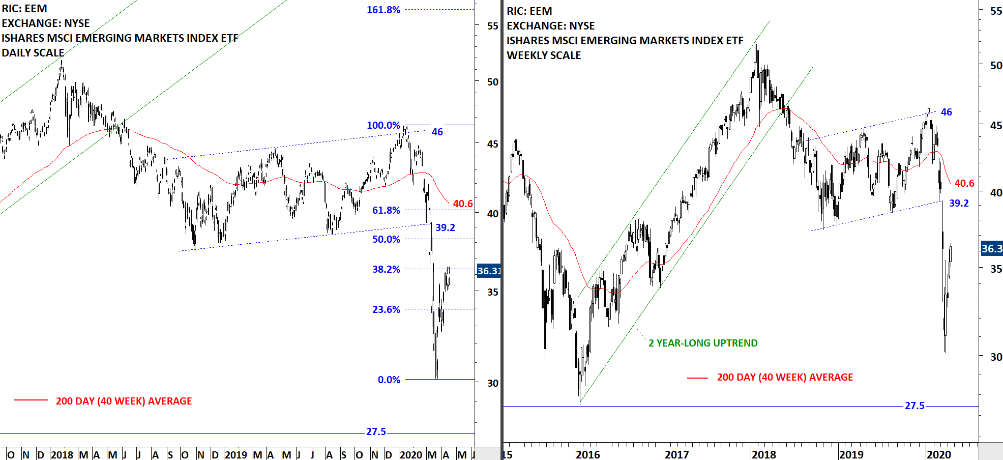 The benchmark for the Emerging Markets performance, the iShares MSCI Emerging Markets Index ETF (EEM) was another price chart that resumed its rebound from oversold conditions. Resistance area formed by the lower boundary of channel and the 200-day average remains between 39.2 and 40.6 levels. The ETF is in a downtrend and there is no chart pattern development on daily and weekly scale price charts. Unlike the ACWI ETF, the rebound on EEM was weak, recovering 38.2% of the Jan-Mar sell-off. Both the daily and weekly scale price charts don’t offer any chart pattern opportunities at this stage.