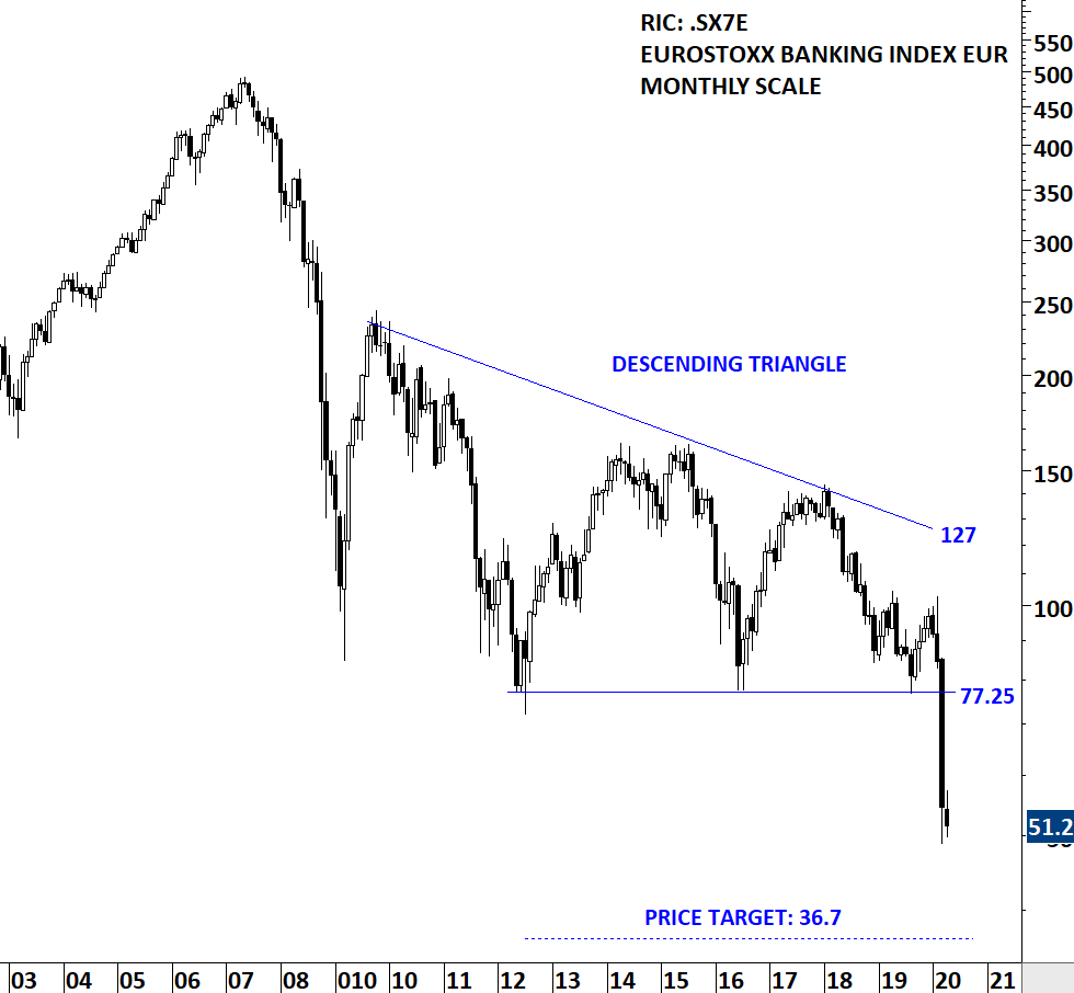 European banks continue to remain weak. While many stocks managed to rebound European banks continued to resume their downtrend. This is a very bearish chart. Breakdown below the horizontal support confirmed the decade-long consolidation as a descending triangle and suggested a price objective at 36.7 levels. 77.25 becomes the new resistance. After a weak monthly close, the price continues to remain weak in April.