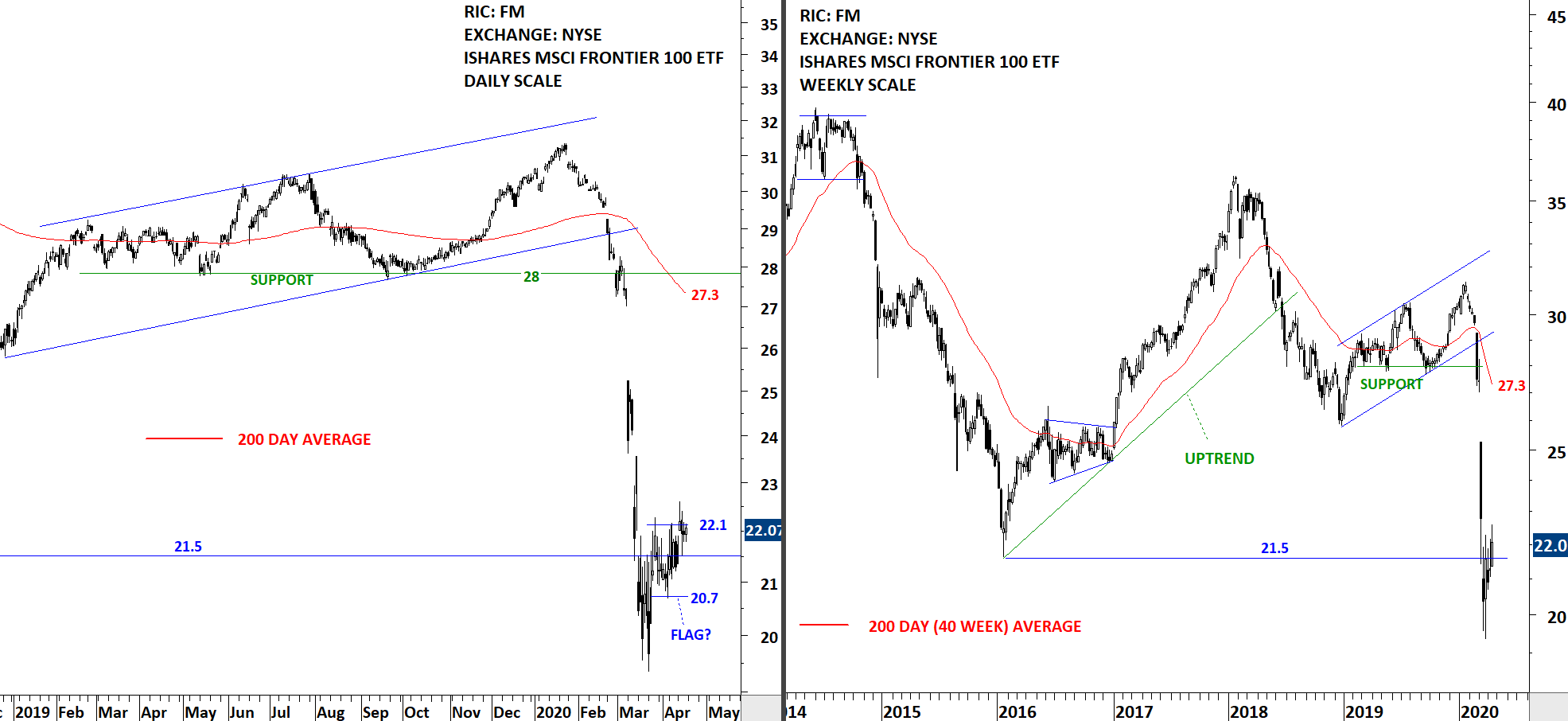 The benchmark for the Frontier equity markets performance, the iShares MSCI Frontier 100 ETF, broke down its support at 21.5 levels. FM ETF is the first one from ACWI, EEM and FM that fell below its 2016 lows. So far the price action has been a pullback to 21.5 levels. I monitor the daily charts for possible reversal signals. Last few week’s consolidation can be a short-term flag. The rebound has been very weak so far. In a risk off environment investors always shy away from high risk instruments and investments. In this case both EM and FM equities fall under high risk, if not for their business prospects, due to their poor liquidity. In a time of forced selling, investors want to be able to find buyers and exit positions. Frontier market equities can be difficult to achieve this. As a result the sell-off has been sharp and recovery has been muted.