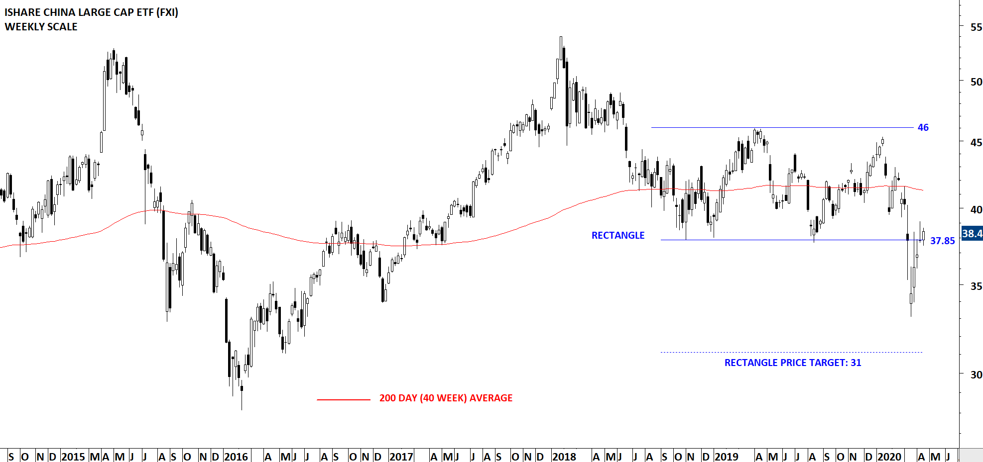 FXI, the Ishares China Large CAP ETF listed on the NYSE has been trading in a range between 37.85 and 46 levels. The ETF continued to consolidate below the broken support at 37.85 levels. This week’s close managed to push above the chart pattern boundary, though I see it as a weak attempt. Another week of strength inside the range is required to call for the breakdown as a failure and conclude for positive outlook in the coming weeks.