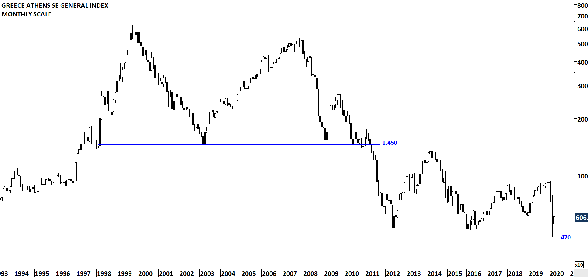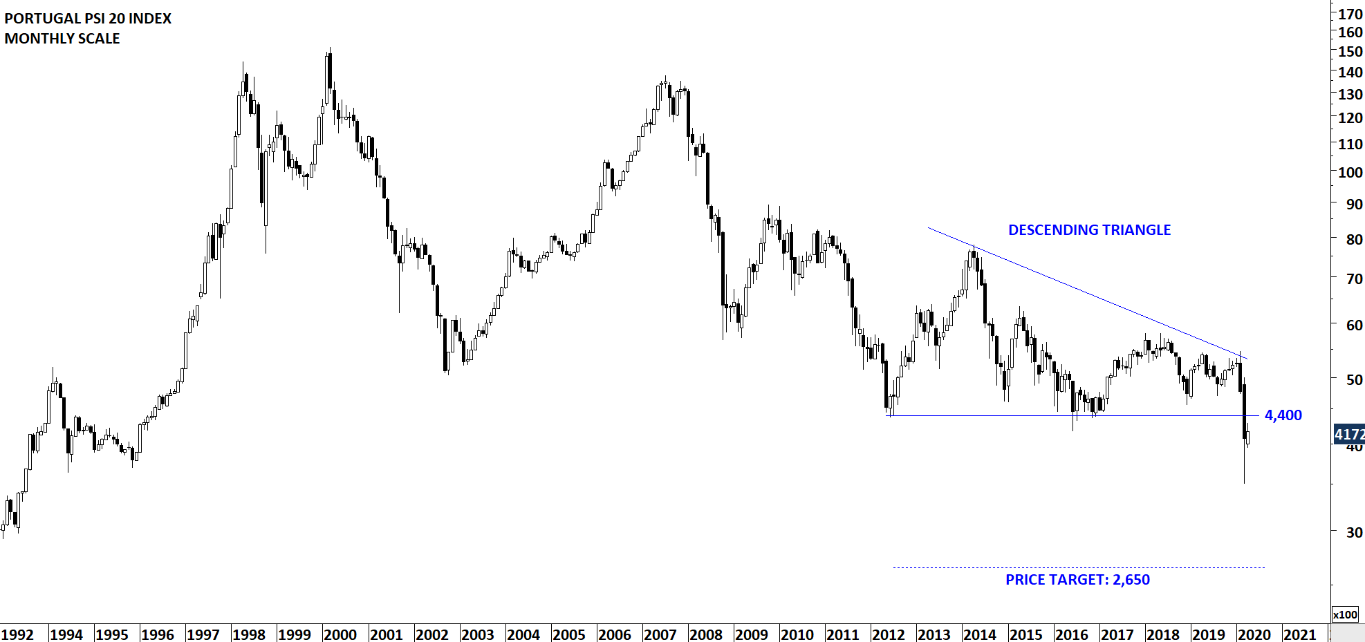 Portugal PSI 20 Index completed a possible multi-year long descending triangle after breaking down the horizontal support at 4,400 levels. Price target for the chart pattern stands at 2,650 levels. This is a very bearish chart development. It is very similar to the European Banking Index chart pattern.
