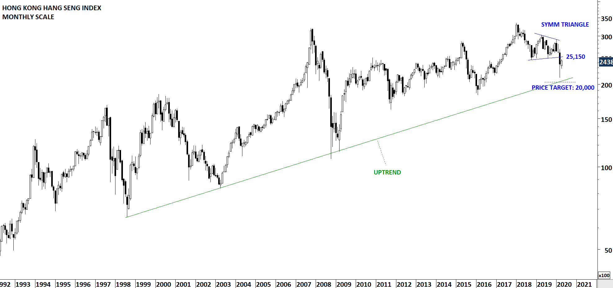 Hong Kong’s Hang Seng Index completed a year-long symmetrical triangle with a chart pattern price target of 20,000 levels. 20,000 is also the long-term trend line support. Hong Kong’s equity benchmark is still considered to be in a long-term uptrend. This month’s price action has been a rebound towards the broken support at 25,150 levels. Previous support becomes the new resistance.
