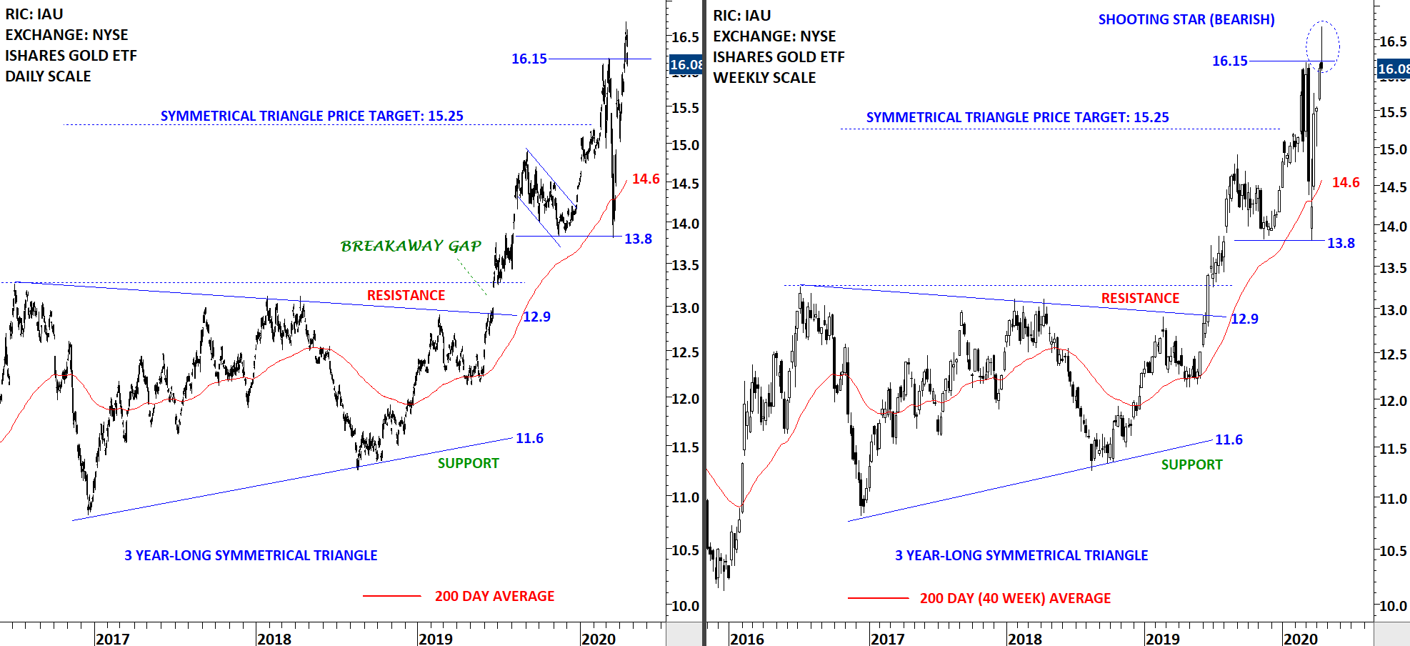 Wild swings between 13.8 and 16.15 has been the norm for the past 2 months. The sharp rebound from 13.8 levels pushed the ETF to test the resistance at 16.15 levels once again. This week’s price action breached the resistance for a short period but failed to close above 16.15 levels. In fact the close, from a candlestick pattern perspective was negative. The pattern is called a shooting star. Price remains above the 200-day average and that is an uptrend. Strong support area remains between 13.8 and 14.5 levels.