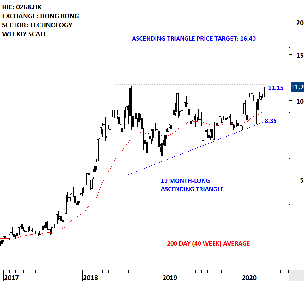 Kingdee International Software Group Company Limited is a Hong Kong-based investment holding company principally engaged in the provision of enterprise resource planning (ERP) services. The Company operates through two segments. ERP and Cloud Services segment is engaged in the sales and implementation of enterprise management software and the provision of related services, the sales of hardware related to enterprise management software arrangements, middleware software businesses and the provision of e-commerce and other online management services. Others segment is engaged in the operation of investment properties. The stock is listed on the Hong Kong Stock Exchange. Price chart formed a 19 month-long ascending triangle with the horizontal boundary acting as strong resistance at 11.15 levels. The horizontal boundary was tested several times over the course of the chart pattern. A daily close above 11.5 levels will confirm the breakout from the 19 month-long ascending triangle with the possible chart pattern price target of 16.4 levels. Stocks that hold well during corrections will be the ones to record new all-time highs when momentum returns. (Learn more: Video Tutorial)