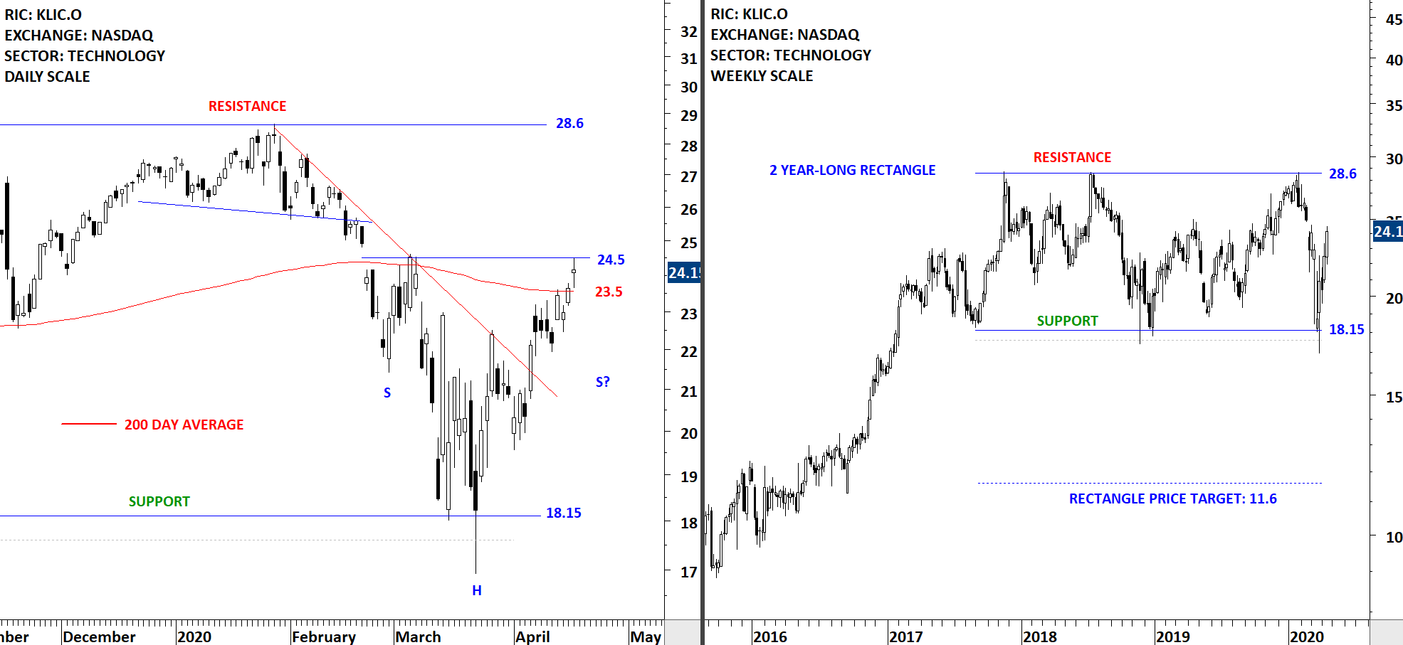 Kulicke and Soffa Industries, Inc. designs, manufactures and sells capital equipment and expendable tools used to assemble semiconductor devices, including integrated circuits (ICs), high and low powered discrete devices, light-emitting diodes (LEDs) and power modules. The stock is listed on the Nasdaq Stock Exchange. Price chart formed a 2 year-long rectangle with the horizontal boundaries acting as strong support at 18.15 levels and resistance at 28.6 levels. Both boundaries were tested several times over the course of the chart pattern. Recovery from the lower boundary of the 2 year-long rectangle pulled the price towards the 200-day average at 23.5 levels. Short-term resistance remains between 24 and 23.5 levels. Until there is a decisive breakout from the 2 year-long rectangle, this chart offer trading opportunity between well-defined boundaries. Even though I featured this chart few weeks back with the aim of highlighting the long-term support level at 18.15 levels, a breakout alert requires a chart pattern completion. Without a clear chart pattern, there is no trade for me. There is now a possibility of a H&S bottom reversal, if the stock can form the right shoulder as pullback to the broken trend line. I will monitor this stock for a possible pullback towards 21-22 area. (Learn more: Support & Resistance)
