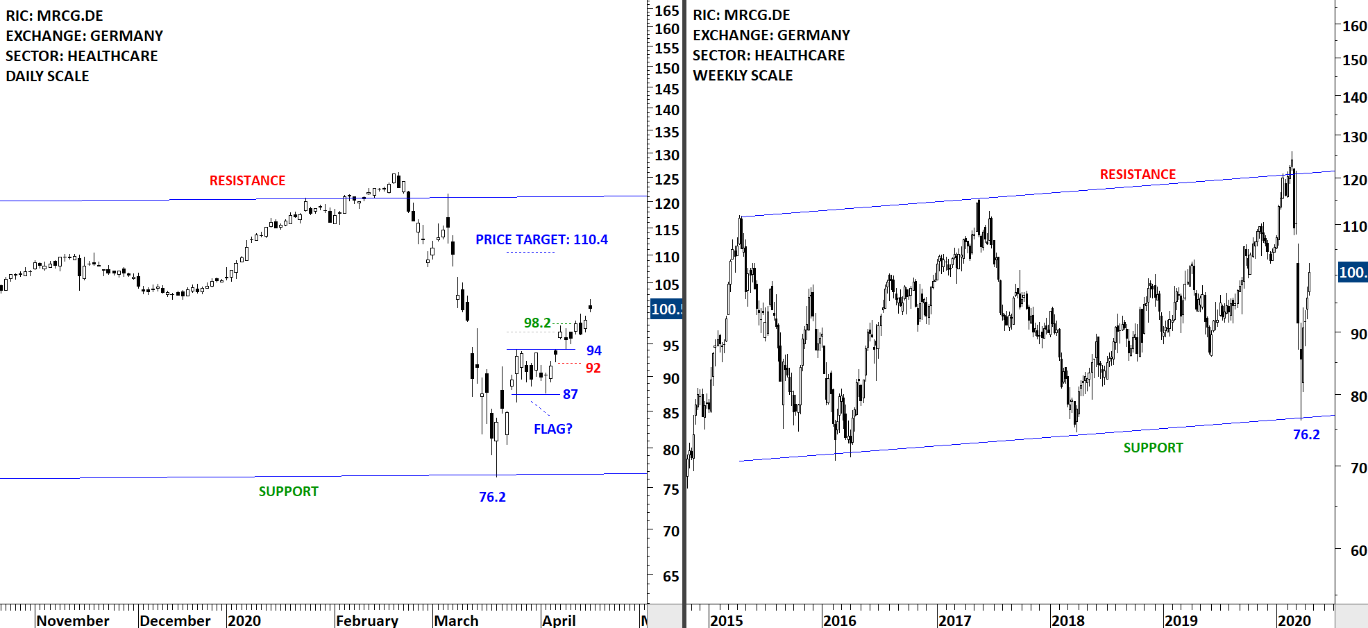 Merck KGaA is a Germany-based science and technology company. The Company operates in three business segments: Healthcare, Life Sciences and Performance Materials. The stock is listed on the Frankfurt Stock Exchange. Price chart formed a multi year-long consolidation range with lower boundary acting as strong support at 76.20 levels. The stock rebounded from the support. Over the past few days MERCK formed a tight consolidation which can be identified as a bullish flag (shown on the daily scale price chart). The upper boundary was at 94 levels. The daily close above 96.8 levels confirmed the short-term bullish continuation with the possible chart pattern price target at 110.4 levels. (Learn more: Flag as a measuring pattern)