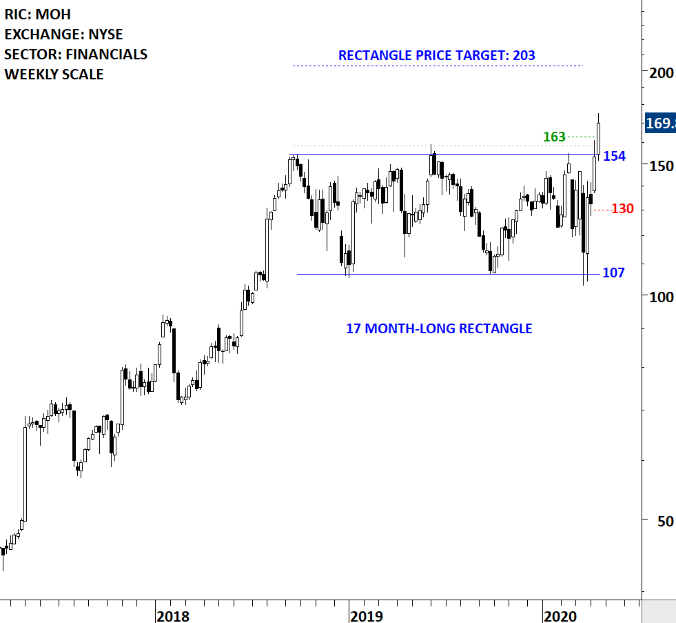 Molina Healthcare, Inc. offers Medicaid-related solutions for low-income families and individuals, and assists government agencies in their administration of the Medicaid program. The stock is listed on the New York Stock Exchange. Price chart formed a 17 month-long rectangle with the horizontal boundary acting as strong resistance at 154.00 levels. The horizontal boundary was tested several times over the course of the chart pattern. The daily close above 158.60 levels confirmed the breakout from the 17 month-long rectangle with the possible chart pattern price target of 203.00 levels. (Learn more: Video Tutorial)