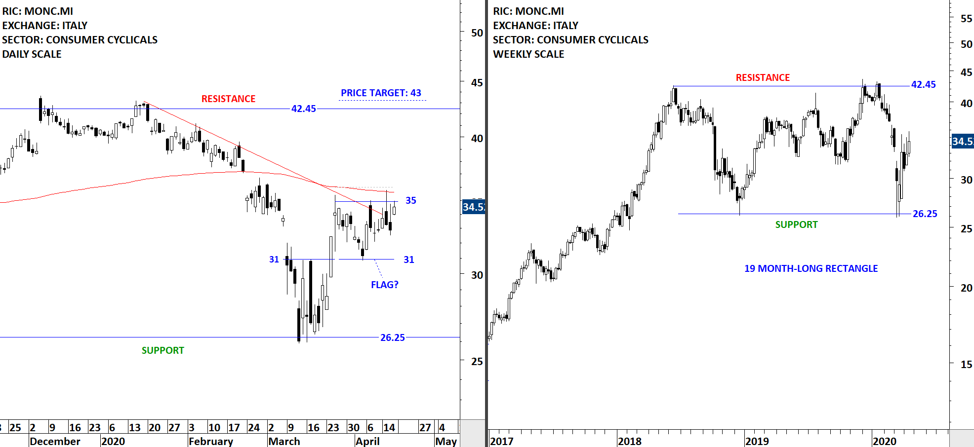 Moncler SpA is an Italy-based company engaged in fashion industry. The Company designs, produces and distributes clothing and accessories through Moncler brand. The stock is listed on the Milan Stock Exchange. Price chart formed a 19 month-long rectangle with the horizontal boundary acting as strong support at 26.26 levels. Moncler had a strong rebound from the horizontal support. Over the past few days the stock formed a short-term consolidation between 31 and 35 levels. The short-term consolidation can be identified as a bullish flag. A daily close above 36 levels will confirm the breakout with the possible chart pattern price target at 43 levels. (Learn more: Support & Resistance)