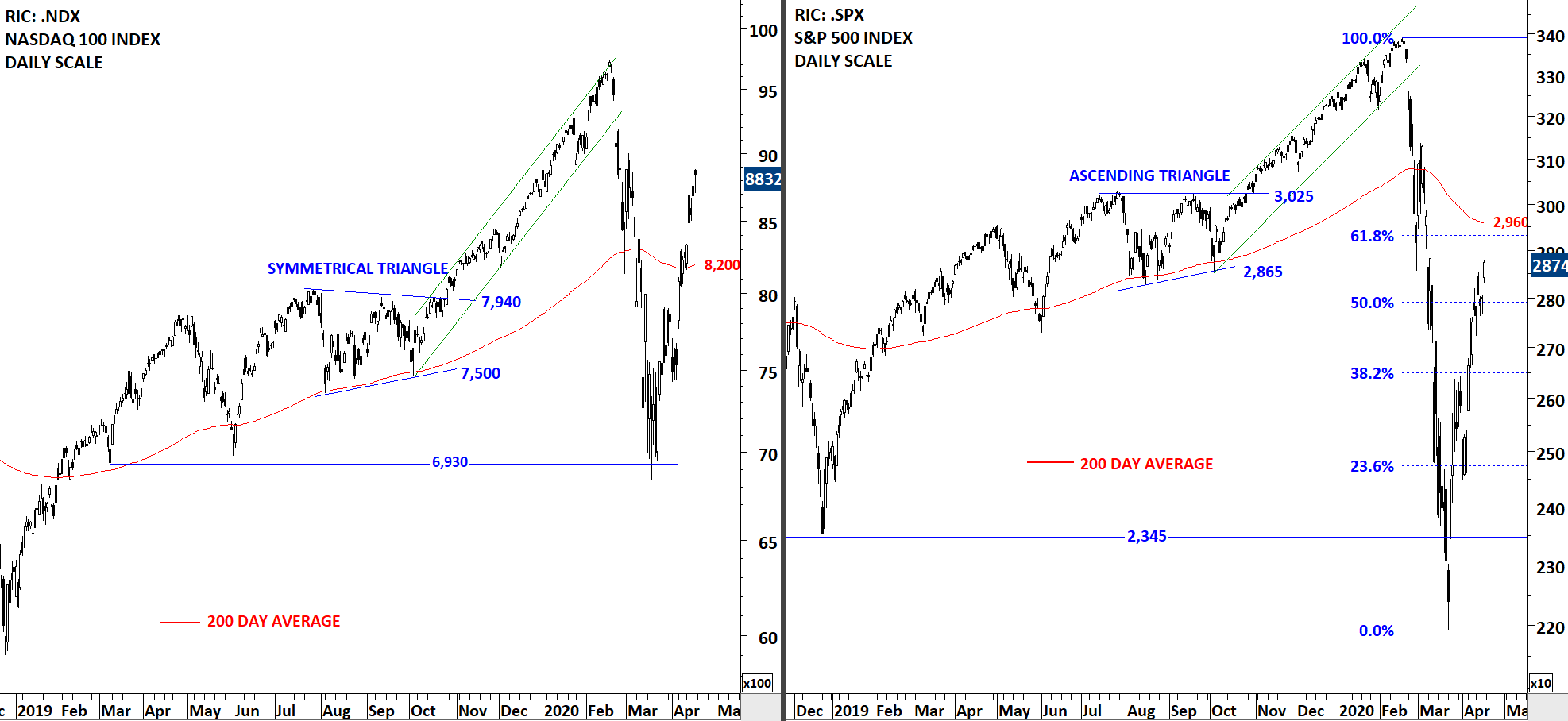Both Nasdaq 100 and S&P 500 rebounded from minor lows that were formed in 2019. While some individual names in indices tested their lows, both Nasdaq 100 and S&P 500 remained above their previous lows (so far). If they manage to hold by forming a higher low, my focus will be to monitor the short-term sideways consolidation for a possible flag/pennant. It is important to note that Nasdaq remained strong when compared with the S&P 500. Nasdaq 100 managed to rebound and close above its 200-day average at 8,200 levels. While the 200-day average for the S&P 500 Index is at 2,970 levels. The recovery for S&P 500 Index is close to 62% of the Jan-March sell-off. That is a strong rebound.