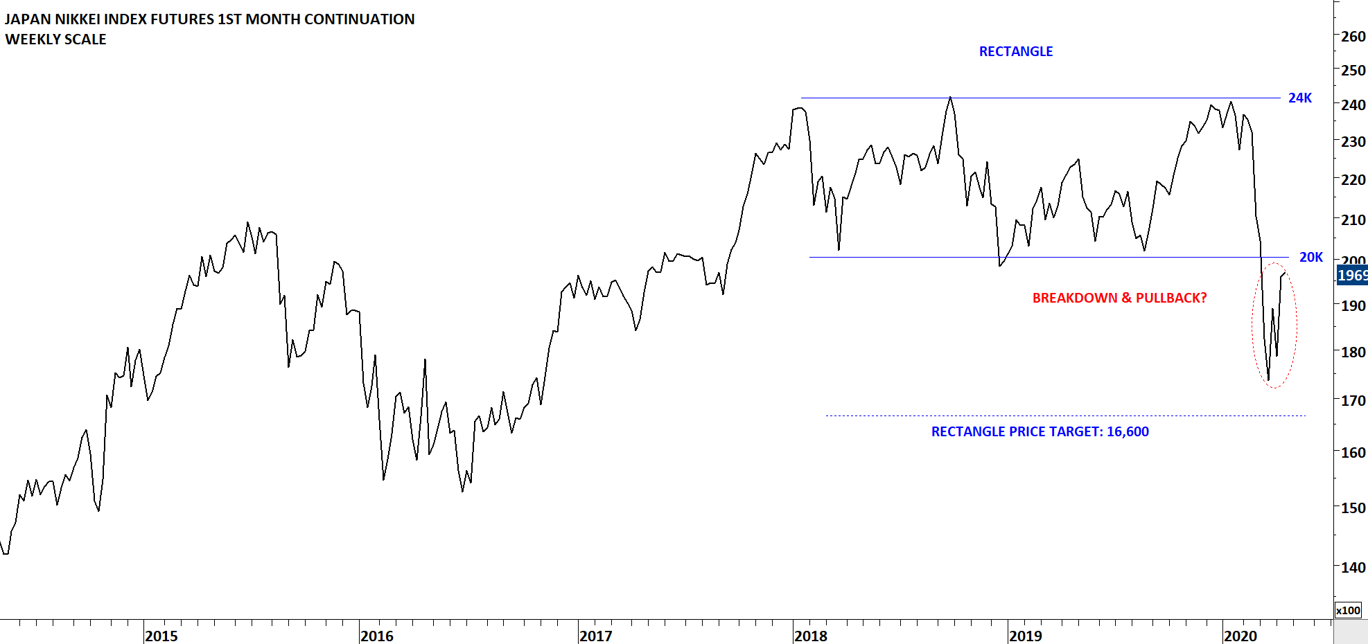 Japan’s NIKKEI 225 Index futures finished the week below the strong resistance at 20,000 levels. The lower boundary of a 2 year-long rectangle was tested several times. The old support is now the new resistance. If Japan’s NIKKEI fails at the strong resistance we can expect further weakness towards the rectangle chart pattern price target at 16,600 levels.