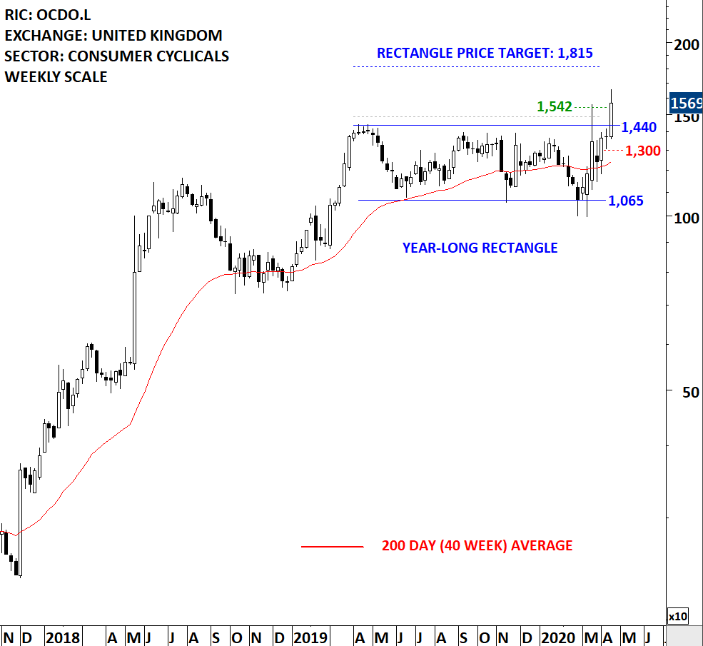 Ocado Group plc is a United Kingdom-based online grocery retailer. The Company’s principal activities are grocery retailing and the development and monetization of Intellectual Property (IP) and technology used for the online retailing, logistics and distribution of grocery and consumer goods, derived from the United Kingdom. The stock is listed on the London Stock Exchange. Price chart formed a year-long rectangle with the horizontal boundary acting as strong resistance at 1,440.0 levels. The horizontal boundary was tested several times over the course of the chart pattern. The daily close above 1,485.0 levels confirmed the breakout from the year-long rectangle with the possible chart pattern price target of 1,815.0 levels. (Learn more: Video Tutorial)