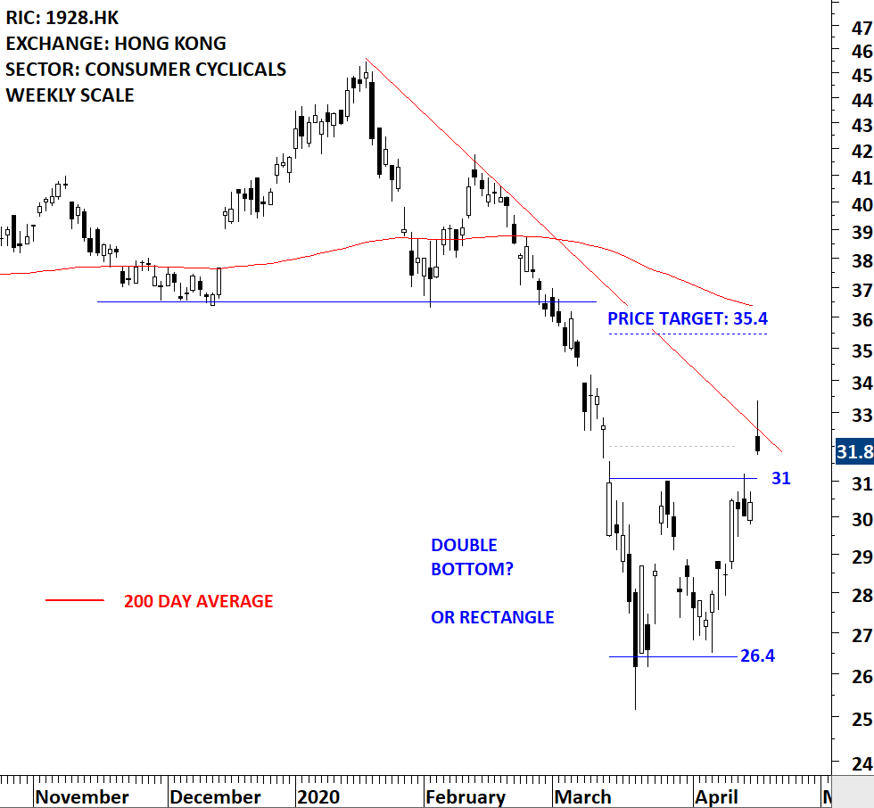 Sands China Ltd. is an investment holding company principally engaged in the development and operation of integrated resorts in Macao. The Company operates many places, including gaming areas, meeting space, convention and exhibition halls, retail and dining areas and entertainment venues. The stock is listed on the Hong Kong Stock Exchange. Price chart is possibly forming a 1 month-long rectangle or double bottom with the horizontal boundary acting as resistance at 31.00 levels. A daily close above 32 levels will confirm the breakout from the 1 month-long rectangle with the possible chart pattern price target of 35.4 levels. Failure to breakout from the 1 month-long consolidation can result in further sideways trading range. Friday’s price action was strong but failed to trigger a breakout alert. The downward sloping trend line acted as short-term resistance. I will monitor this chart for another attempt to close above the downward sloping trend line and confirm the breakout with a decisive close above 32 levels.