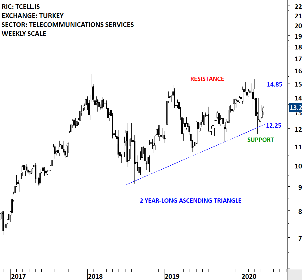 Turkcell Iletisim Hizmetleri AS is engaged in establishing and operating a Global System for Mobile Communications (GSM) network in Turkey and regional states. The stock is listed on the Istanbul Stock Exchange. Price chart formed a 2 year-long ascending triangle with the horizontal boundary acting as strong resistance at 14.85 levels. The lower boundary (upward sloping trend line) is forming support at 12.25 levels. If the chart pattern identified is an ascending triangle, last few week’s low marked a medium-term bottom. I will monitor this stock with the possibility of forming a trading range between 12.25 and 14.85 levels. (Learn more: Video Tutorial)