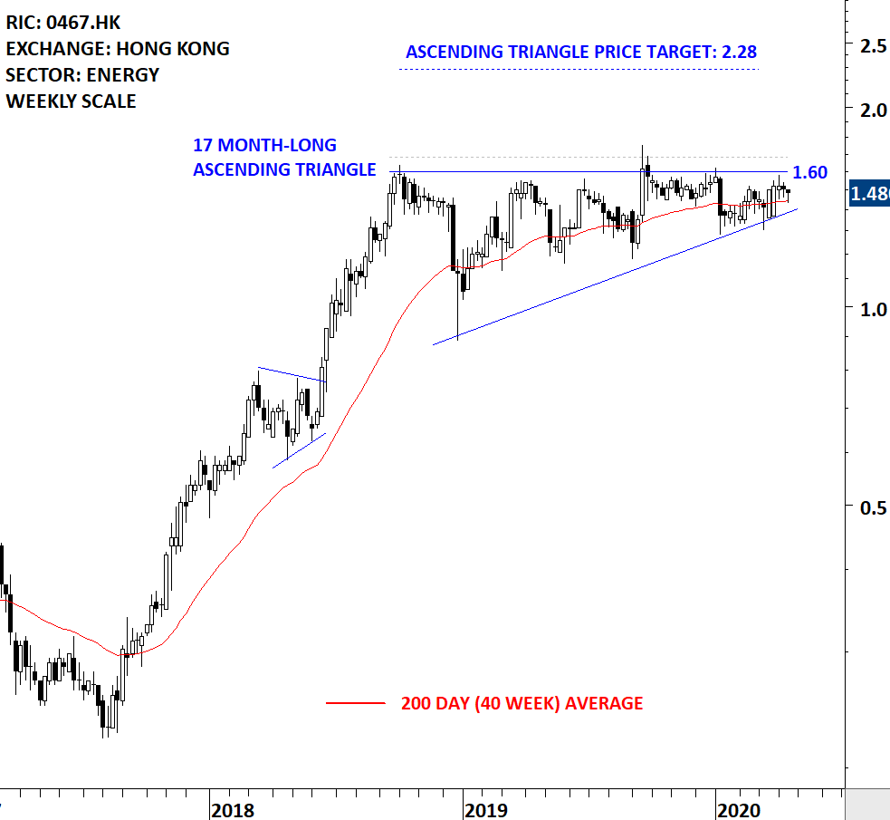 UNITED ENERGY GROUP LIMITED is a Hong Kong-based investment holding company principally engaged in petroleum and natural gas businesses. The stock is listed on the Hong Kong Stock Exchange. Price chart formed a 17 month-long ascending triangle with the horizontal boundary acting as strong resistance at 1.60 levels. The horizontal boundary was tested several times over the course of the chart pattern. A daily close above 1.68 levels will confirm the breakout from the 17 month-long ascending triangle with the possible chart pattern price target of 2.28 levels. Stocks that hold well during corrections will be the ones to record new all-time highs when momentum returns. (Learn more: Video Tutorial)