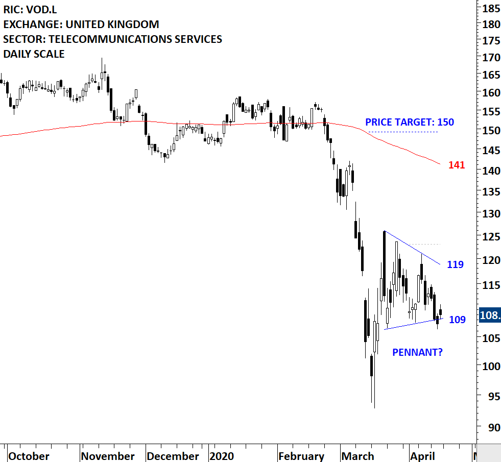 Vodafone Group Plc is a telecommunications company. The Company’s business is organized into two geographic regions: Europe, and Africa, Middle East and Asia Pacific (AMAP). The stock is listed on the London Stock Exchange. Price chart is possibly forming a 1 month-long pennant with the upper boundary acting as resistance at 119.00 levels. A daily close above 123 levels will confirm the breakout from the 1 month-long pennant with the possible chart pattern price target of 150 levels. Short-term chart patterns fail more often than long-term chart patterns.