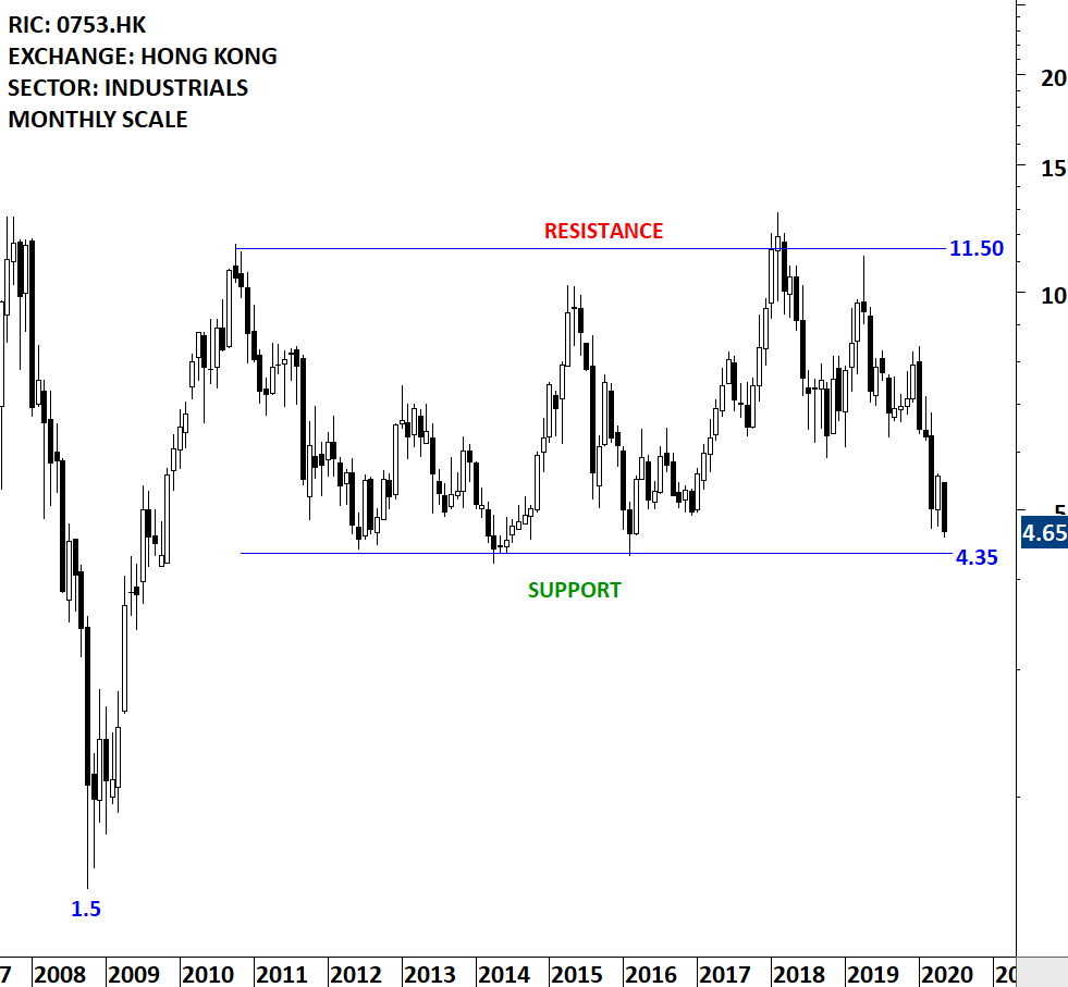 Air China Limited is a China-based company principally engaged in the provision of air passenger transportation, freight transportation, postal transportation and maintenance services in Mainland China, Hong Kong, Macau and foreign regions. The Company is also engaged in domestic and international business aviation businesses, plane business, aircraft maintenance, airlines business agents, ground and air express services related to main businesses, duty free on boards, retail business on boards and aviation accident insurance sales agents business. The stock is listed on the Hong Kong Stock Exchange. Price chart formed a decade-long rectangle with the horizontal boundary acting as strong support at 4.35 levels. The horizontal boundary was tested several times over the course of the chart pattern. Given the Global pandemic and its effects, it is hard to justify a long trade idea in the airline industry. However, the levels Air China is testing can offer a long-term opportunity. (Learn more: Support & Resistance)