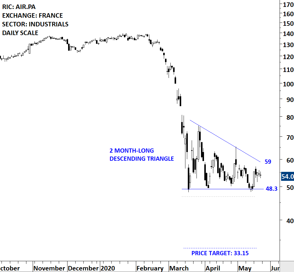 Airbus SE, formerly Airbus Group SE, is a company based in the Netherlands that is active in the aerospace and defense industry. The Company operates through three segments: Airbus, Airbus Helicopters and Airbus Defence and Space. The stock is listed on the Paris Stock Exchange. Price chart formed a 2 month-long descending triangle with the lower boundary acting as support at 48.3 levels. A daily close below 46.85 levels will confirm the breakdown from the bearish continuation chart pattern with the possible price objective of 33.15 levels. (Learn more: Video Tutorial)