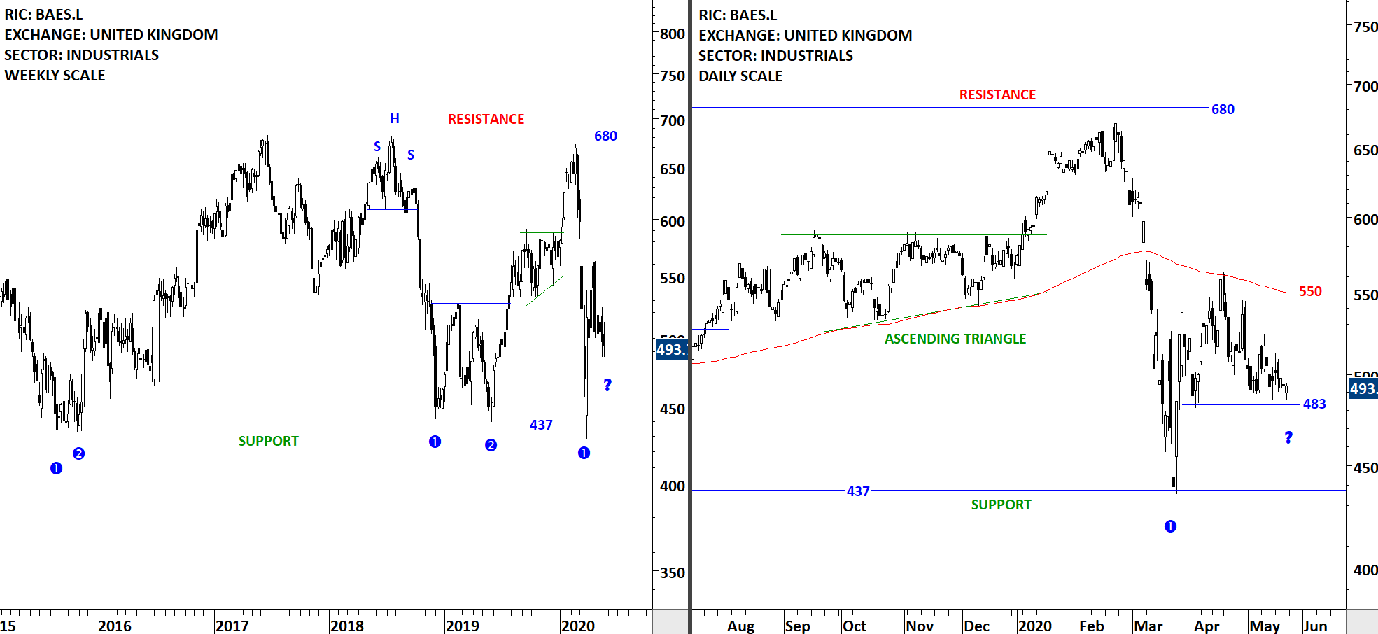 BAE Systems plc is a defense, aerospace and security company. The stock is listed on the London Stock Exchange. Price chart formed multi year-long consolidation with the horizontal boundary acting as strong support at 437.0 levels. The horizontal boundary was tested several times over the course of the chart pattern. Sharp sell-off from the upper boundary around 680 levels pulled the stock to 437 levels in a short period of time. The rebound was sharp. I’ve labelled earlier bottom reversal chart patterns. A re-test of the horizontal boundary can offer a buying opportunity. I will monitor this chart for possible bottom reversal chart patterns around strong support. The daily chart is added below. If the minor low acted as support at 483 levels, the stock can trade between 483 and 550. (Learn more: Support & Resistance)