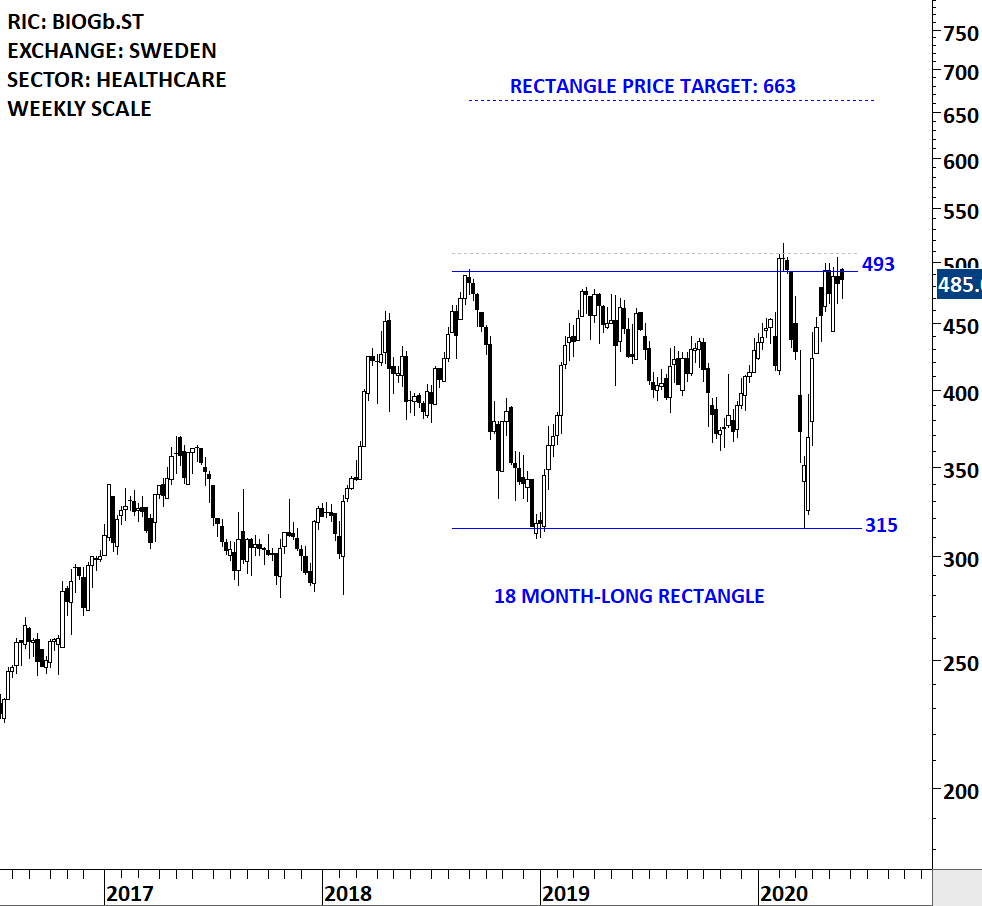 Biogaia AB is a Sweden-based company engaged in the development and sell of probiotic products, primarily based on the Lactobacillus reuteri bacteria. The stock is listed on the Stockholm Stock Exchange. Price chart formed an 18 month-long rectangle with the horizontal boundary acting as strong resistance at 493.00 levels. The horizontal boundary was tested several times over the course of the chart pattern. A daily close above 508.0 levels will confirm the breakout from the 18 month-long rectangle with the possible chart pattern price target of 663.0 levels. Breakout can push the stock to all-time highs. (Learn more: Video Tutorial)