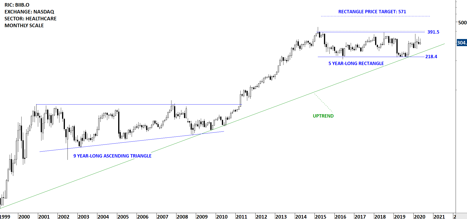 Biogen Inc. is a biopharmaceutical company. The Company focuses on discovering, developing, manufacturing and delivering therapies to people living with serious neurological, rare and autoimmune diseases. The stock is listed on the Nasdaq Stock Exchange. Price chart formed a 5 year-long rectangle with the horizontal boundary acting as strong resistance at 391.50 levels. The horizontal boundary was tested several times over the course of the chart pattern. A daily close above 405.00 levels will confirm the breakout from the 5 year-long rectangle with the possible chart pattern price target of 571.00 levels. (Learn more: Video Tutorial)