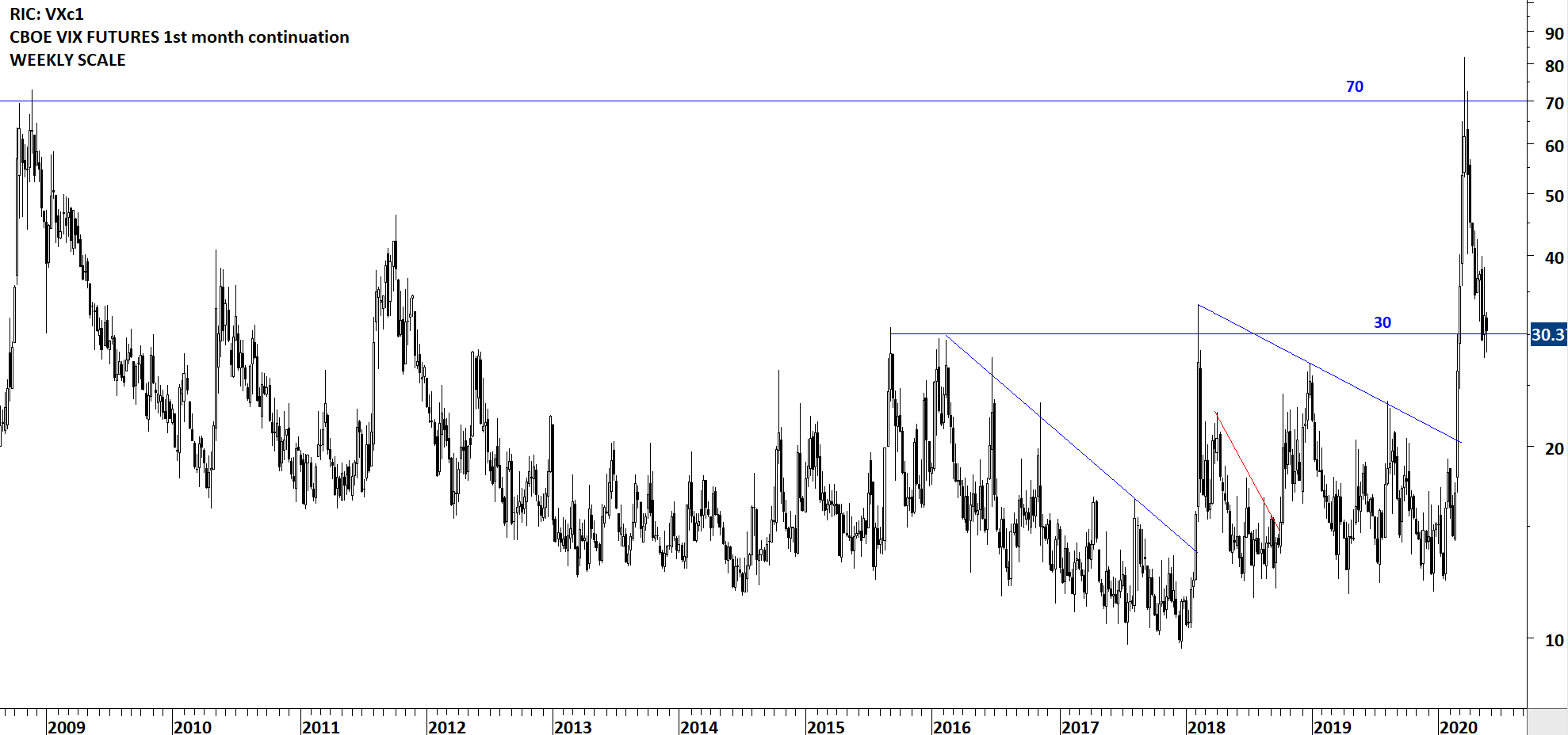 CBOE Volatility Index futures found support at 30 levels, a level that the index cleared during the COVID pandemic sell-off. 30 levels became the new support. Unless we see a major recovery in Global markets, VIX can remain between 30 and 70 for some time. Breakdown below 30 levels will be bullish for Global equities. Following weeks will be important to see how VIX will perform and its effect on Global equities.