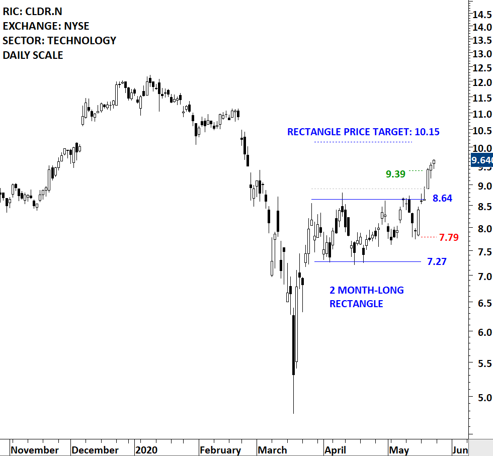 Cloudera, Inc. is a developer of platform for data management, machine learning and advanced analytics. The Company allows enterprises to operate, manage and move workloads across multiple architectures, mixing on premises and cloud environments, including all major public cloud infrastructure providers. The stock is listed on the New York Stock Exchange. Price chart formed a 2 month-long rectangle with the horizontal boundary acting as strong resistance at 8.64 levels. The horizontal boundary was tested several times over the course of the chart pattern. The daily close above 8.90 levels confirmed the breakout from the 2 month-long rectangle with the possible chart pattern price target of 10.15 levels. (Learn more: Video Tutorial)